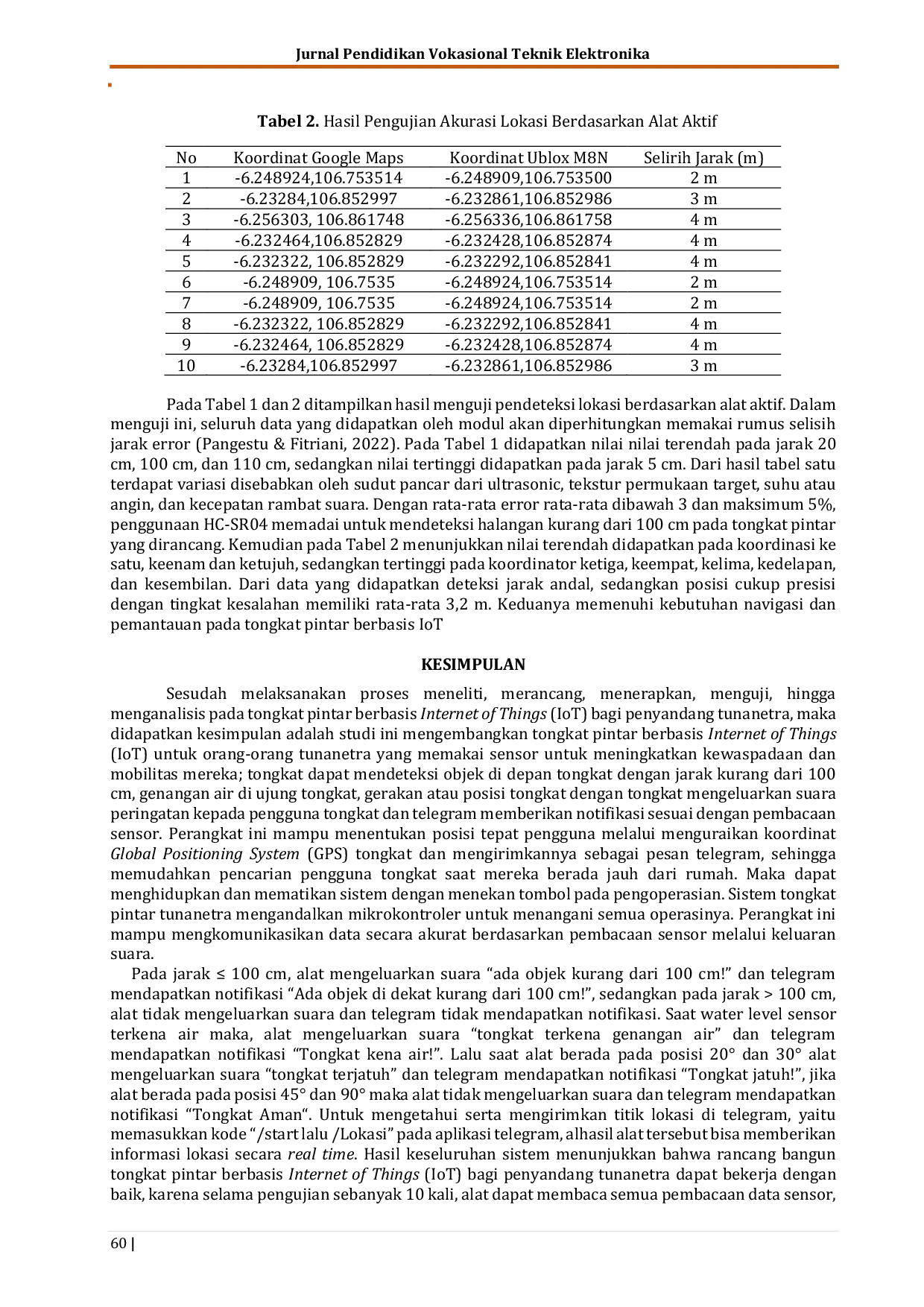 JURNAL PENDIDIKAN VOKASIONAL TEKNIK ELEKTRONIKA (JVoTE)JURNAL PENDIDIKAN VOKASIONAL TEKNIK ELEKTRONIKA (JVoTE)Penelitian ini merancang dan menguji tongkat pintar berbasis Internet of Things (IoT) bagi penyandang tunanetra. Metode penelitian menggunakan Research and Development (Borg & Gall) dengan prototipe yang memadukan ESP32, sensor ultrasonik, water level sensor, dan gyroscope. Integrasi IoT dilakukan melalui bot Telegram untuk notifikasi pembacaan sensor dan pengiriman koordinat GPS. Pengujian fungsional menunjukkan deteksi objek di depan efektif pada jarak <100 cm dan deteksi genangan berhasil mengaktifkan peringatan suara serta notifikasi. Pengujian jaringan memperlihatkan keterlambatan notifikasi yang bervariasi antar lokasi, sehingga peringatan suara lokal dipakai sebagai jalur utama keselamatan, sedangkan Telegram bersifat pendukung. Kesimpulannya, prototipe berfungsi baik untuk deteksi halangan, genangan, dan pelacakan lokasi, serta layak dikembangkan lebih lanjut dengan optimasi penempatan sensor dan konektivitas.