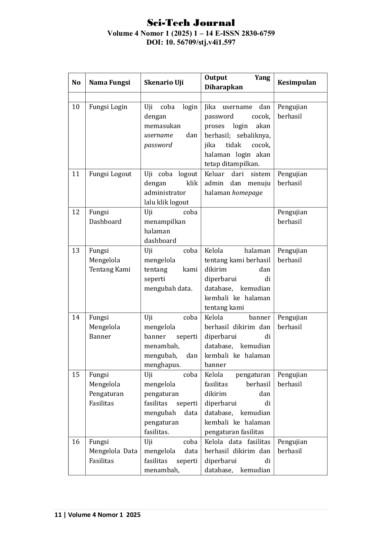 Sci-tech JournalSci-tech JournalPendidikan Islam memainkan peran penting dalam kemajuan dunia pendidikan dengan mengimplementasikan sistem yang holistik dan integratif. Keberhasilan lembaga pendidikan Islam tidak hanya bergantung pada kualitas pendidikan, tetapi juga pada bagaimana informasi tentang lembaga tersebut dikelola dan dipromosikan. Pondok Pesantren Sunannurrahman, sebuah lembaga pendidikan Islam di Bogor, memiliki visi untuk mengembangkan generasi Muslim yang berilmu dan berakhlak. Namun, informasi mengenai pondok pesantren ini masih disampaikan melalui media yang terbatas, seperti WhatsApp, Instagram, dan spanduk, yang mengakibatkan penyampaian informasi kurang efektif. Penelitian ini bertujuan untuk merancang dan mengimplementasikan website profil untuk Pondok Pesantren Sunannurrahman guna meningkatkan efisiensi penyampaian informasi dan memperluas jangkauan audiens. Website ini diharapkan dapat menyediakan platform terpadu untuk mengelola informasi mengenai profil pondok, fasilitas, berita, galeri foto kegiatan, dan pengumuman. Metode penelitian yang diterapkan dalam penelitian ini adalah metode waterfall, yang mencakup pengumpulan data, analisis, perancangan, pengkodean, dan pengujian. Hasil penelitian menunjukkan bahwa website ini berhasil menyediakan platform yang efisien dan mudah diakses, serta mampu menjangkau audiens yang lebih luas, termasuk calon santri dan masyarakat umum. Dengan adanya website ini, Pondok Pesantren Sunannurrahman dapat memperkenalkan lembaga dan menyebarkan informasi penting dengan lebih efektif.