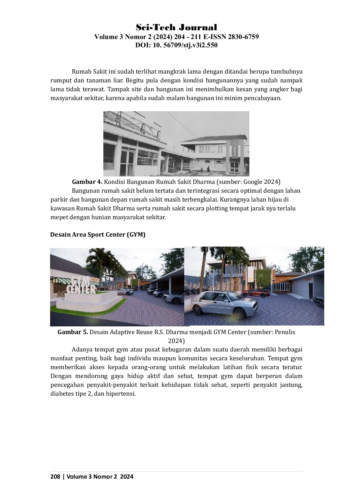 Sci-tech JournalSci-tech JournalPenelitian ini berfokus pada adaptasi ulang (adaptive reuse) bangunan Rumah Sakit Dharma menjadi pusat kebugaran (fitness) dan kafe (cafe) dengan menggunakan metode kuantitatif. Tujuan dari penelitian ini adalah untuk mengevaluasi dan memahami bagaimana bangunan rumah sakit yang ada dapat diubah dan dimanfaatkan kembali dengan cara yang menarik dan menguntungkan. Metode kuantitatif digunakan untuk mengumpulkan dan menganalisis data tentang kondisi fisik bangunan, kebutuhan ruang, dan preferensi pengguna. Hasil penelitian menunjukkan bahwa dengan pendekatan yang kreatif, bangunan rumah sakit dapat diadaptasi untuk menjadi pusat kebugaran dan kafe yang modern dan nyaman sambil mempertahankan nilai historis dan arsitekturalnya. Kesimpulan dari penelitian ini adalah bahwa adaptive reuse adalah strategi yang inovatif dan potensial untuk memanfaatkan kembali bangunan rumah sakit yang tidak lagi digunakan. Ini tidak hanya dapat meningkatkan kualitas hidup dan kesehatan masyarakat, tetapi juga dapat memberikan nilai tambah ekonomi dan sosial.