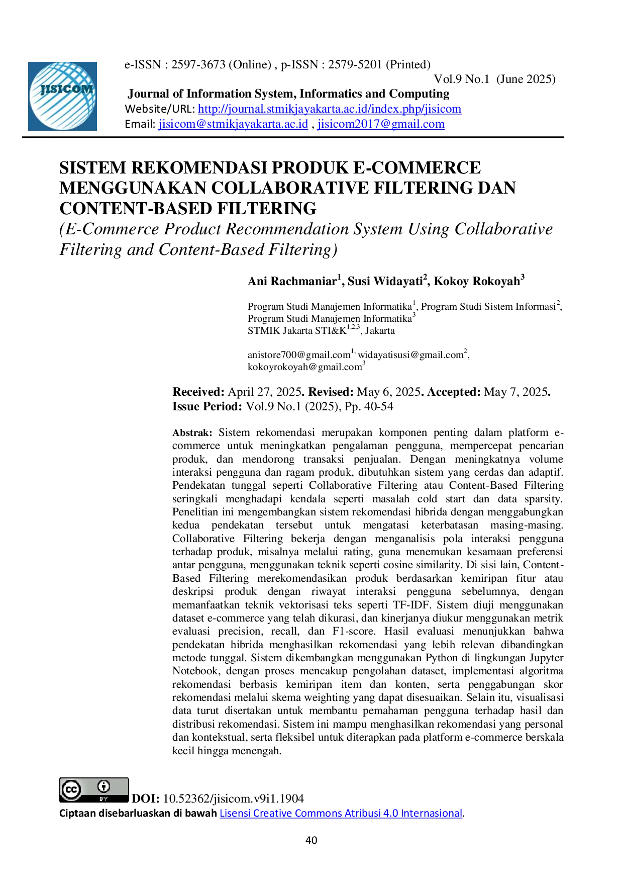 Journal of Information System, Informatics and ComputingJournal of Information System, Informatics and ComputingSistem rekomendasi merupakan komponen penting dalam platform e-commerce untuk meningkatkan pengalaman pengguna, mempercepat pencarian produk, dan mendorong transaksi penjualan. Dengan meningkatnya volume interaksi pengguna dan ragam produk, dibutuhkan sistem yang cerdas dan adaptif. Pendekatan tunggal seperti Collaborative Filtering atau Content-Based Filtering seringkali menghadapi kendala seperti masalah cold start dan data sparsity. Penelitian ini mengembangkan sistem rekomendasi hibrida dengan menggabungkan kedua pendekatan tersebut untuk mengatasi keterbatasan masing-masing. Collaborative Filtering bekerja dengan menganalisis pola interaksi pengguna terhadap produk, misalnya melalui rating, guna menemukan kesamaan preferensi antar pengguna, menggunakan teknik seperti cosine similarity. Di sisi lain, Content-Based Filtering merekomendasikan produk berdasarkan kemiripan fitur atau deskripsi produk dengan riwayat interaksi pengguna sebelumnya, dengan memanfaatkan teknik vektorisasi teks seperti TF-IDF. Sistem diuji menggunakan dataset e-commerce yang telah dikurasi, dan kinerjanya diukur menggunakan metrik evaluasi precision, recall, dan F1-score. Hasil evaluasi menunjukkan bahwa pendekatan hibrida menghasilkan rekomendasi yang lebih relevan dibandingkan metode tunggal. Sistem dikembangkan menggunakan Python di lingkungan Jupyter Notebook, dengan proses mencakup pengolahan dataset, implementasi algoritma rekomendasi berbasis kemiripan item dan konten, serta penggabungan skor rekomendasi melalui skema weighting yang dapat disesuaikan. Selain itu, visualisasi data turut disertakan untuk membantu pemahaman pengguna terhadap hasil dan distribusi rekomendasi. Sistem ini mampu menghasilkan rekomendasi yang personal dan kontekstual, serta fleksibel untuk diterapkan pada platform e-commerce berskala kecil hingga menengah.