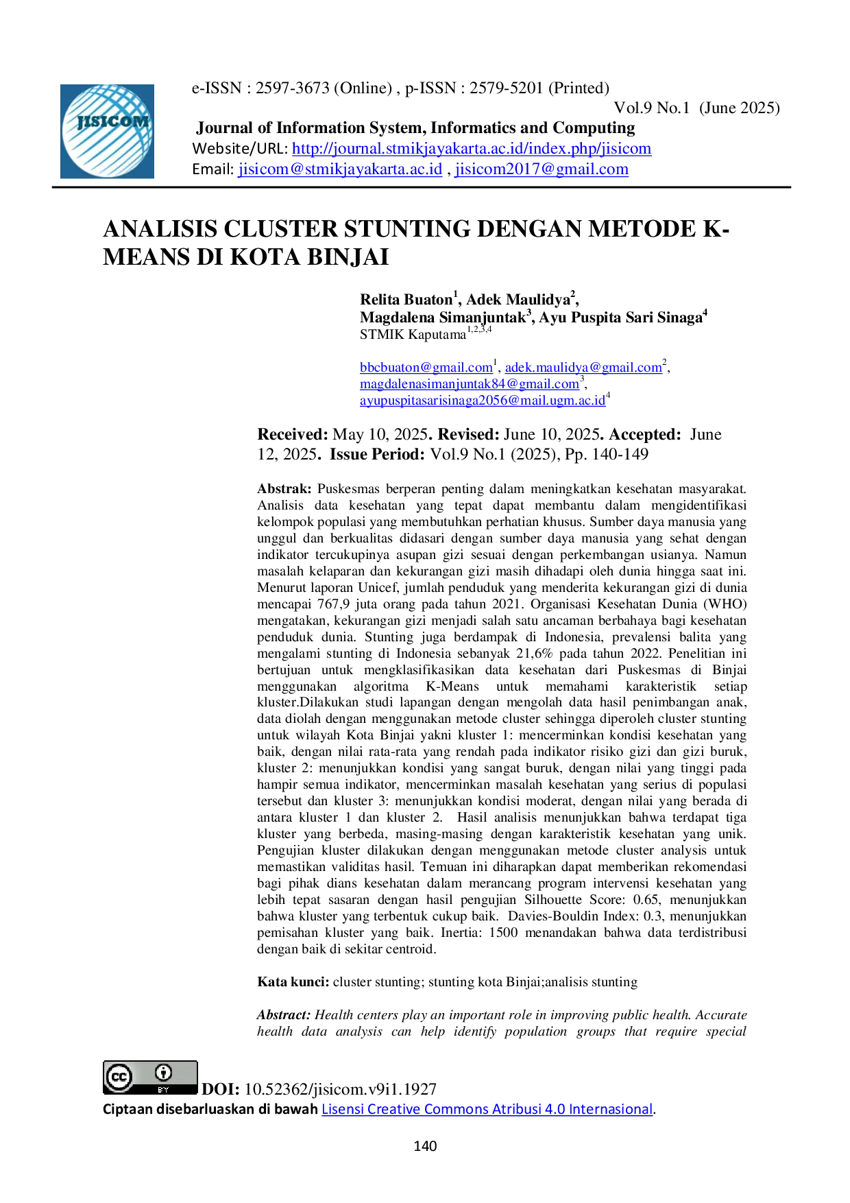 Journal of Information System, Informatics and ComputingJournal of Information System, Informatics and ComputingPuskesmas berperan penting dalam meningkatkan kesehatan masyarakat. Analisis data kesehatan yang tepat dapat membantu dalam mengidentifikasi kelompok populasi yang membutuhkan perhatian khusus. Sumber daya manusia yang unggul dan berkualitas didasari dengan sumber daya manusia yang sehat dengan indikator tercukupinya asupan gizi sesuai dengan perkembangan usianya. Namun masalah kelaparan dan kekurangan gizi masih dihadapi oleh dunia hingga saat ini. Menurut laporan Unicef, jumlah penduduk yang menderita kekurangan gizi di dunia mencapai 767,9 juta orang pada tahun 2021. Organisasi Kesehatan Dunia (WHO) mengatakan, kekurangan gizi menjadi salah satu ancaman berbahaya bagi kesehatan penduduk dunia. Stunting juga berdampak di Indonesia, prevalensi balita yang mengalami stunting di Indonesia sebanyak 21,6% pada tahun 2022. Penelitian ini bertujuan untuk mengklasifikasikan data kesehatan dari Puskesmas di Binjai menggunakan algoritma K-Means untuk memahami karakteristik setiap kluster. Dilakukan studi lapangan dengan mengolah data hasil penimbangan anak, data diolah dengan menggunakan metode cluster sehingga diperoleh cluster stunting untuk wilayah Kota Binjai yakni kluster 1: mencerminkan kondisi kesehatan yang baik, dengan nilai rata-rata yang rendah pada indikator risiko gizi dan gizi buruk, kluster 2: menunjukkan kondisi yang sangat buruk, dengan nilai yang tinggi pada hampir semua indikator, mencerminkan masalah kesehatan yang serius di populasi tersebut dan kluster 3: menunjukkan kondisi moderat, dengan nilai yang berada di antara kluster 1 dan kluster 2. Hasil analisis menunjukkan bahwa terdapat tiga kluster yang berbeda, masing-masing dengan karakteristik kesehatan yang unik. Pengujian kluster dilakukan dengan menggunakan metode cluster analysis untuk memastikan validitas hasil. Temuan ini diharapkan dapat memberikan rekomendasi bagi pihak dians kesehatan dalam merancang program intervensi kesehatan yang lebih tepat sasaran dengan hasil pengujian Silhouette Score: 0.65, menunjukkan bahwa kluster yang terbentuk cukup baik.