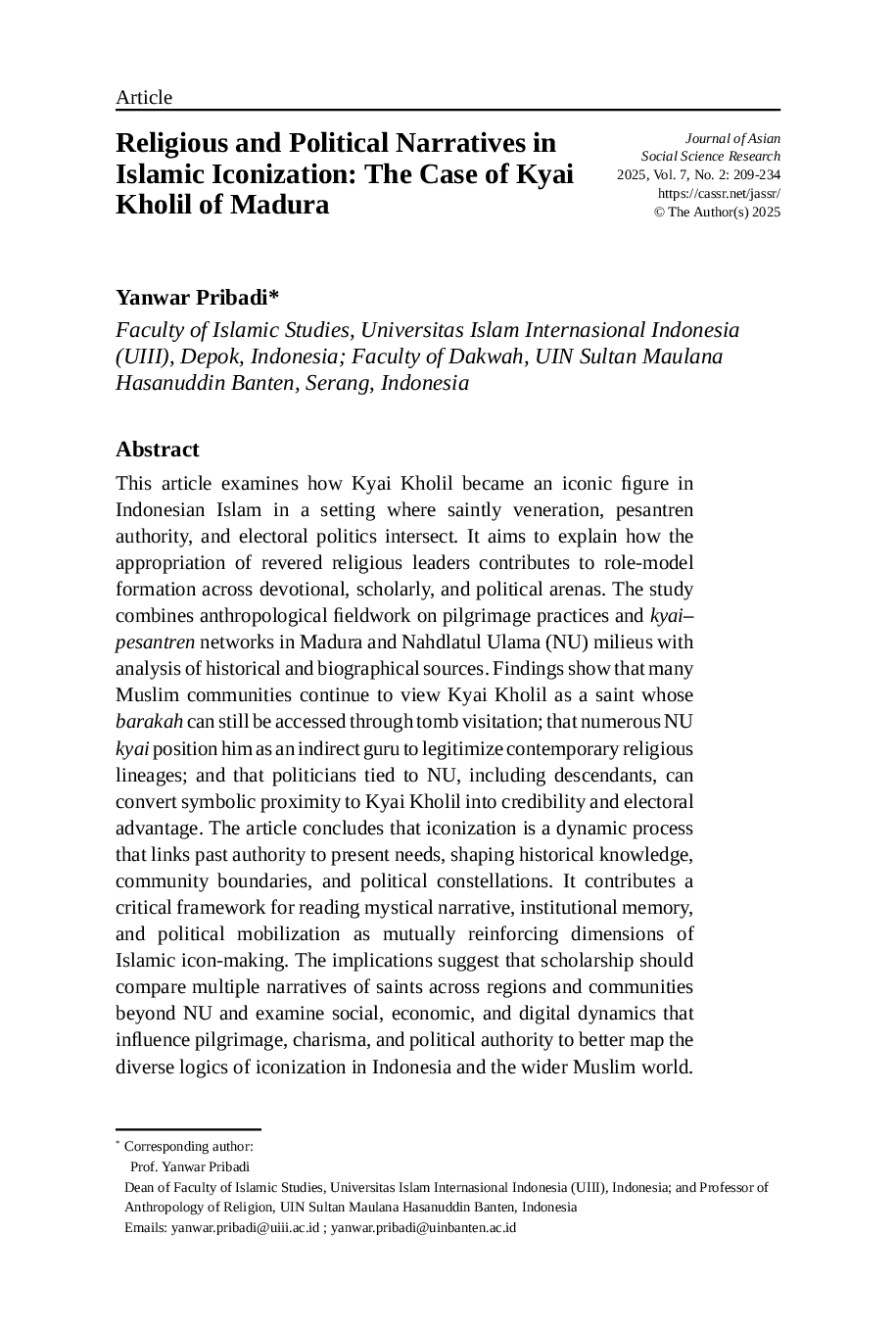 Journal of Asian Social Science ResearchJournal of Asian Social Science ResearchArtikel ini memeriksa bagaimana Kyai Kholil menjadi tokoh ikonik dalam Islam Indonesia di tengah kemuliaan mistis, otoritas pesantren, dan politik elektoral. Penelitian menggabungkan lapangan antropologi tentang praktik ziarah dan jaringan kyai-pesantren di Madura dan lingkungan Nahdlatul Ulama (NU) dengan analisis sumber sejarah dan biografi. Temuan menunjukkan bahwa banyak komunitas Muslim masih menganggap Kyai Kholil sebagai seorang wali yang barakah bisa diakses melalui kunjungan kuburnya; bahwa banyak kyai NU menganggapnya sebagai guru tidak langsung untuk meligitimasi keturunan keagamaan; dan bahwa politisi yang terkait dengan NU dapat mengubah proximitas simbolis ke Kyai Kholil menjadi kredibilitas dan keunggulan elektoral. Artikel ini menyimpulkan bahwa penyematian ikon merupakan proses dinamis yang menghubungkan otoritas masa lalu dengan kebutuhan saat ini, membentuk pengetahuan sejarah, batas komunitas, dan konstelasi politik. Artikel ini menawarkan kerangka kritis untuk membaca narasi mistis, memori institusional, dan mobilisasi politik sebagai dimensi saling memperkuat dari pembuatan ikon Islam.