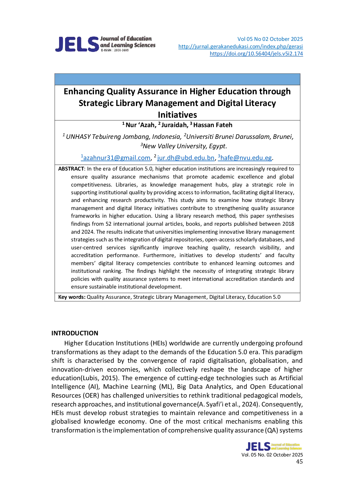 - Enhancing Quality Assurance in Higher Education through Strategic Library Management and Digital Literacy... jurnal.gerakanedukasi.com/index.php/gerasi/article/view/174Enhancing Quality Assurance in Higher Education through Strategic Library Management and Digital Literacy jurnal gerakanedukasi index php gerasi article view 174
