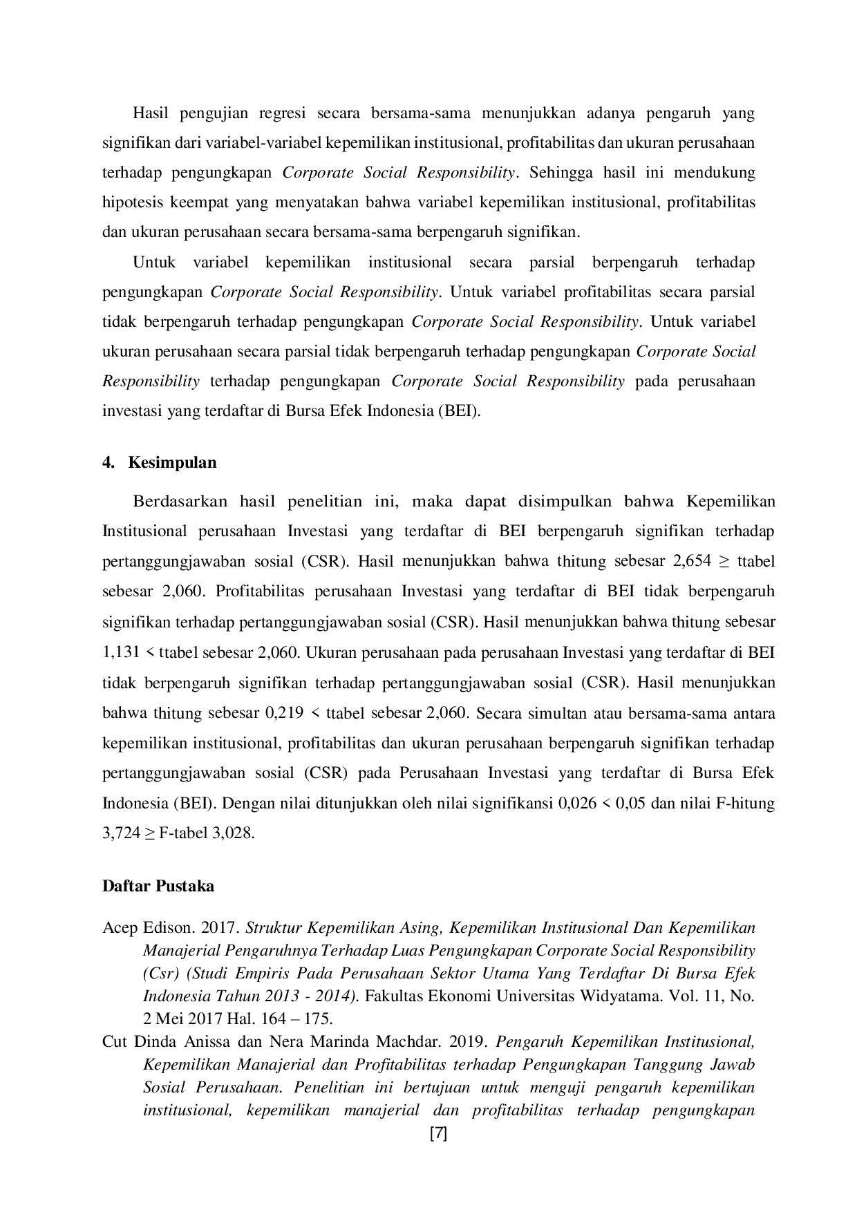 Berdasarkan hasil penelitian, dapat disimpulkan bahwa kepemilikan institusional perusahaan Investasi yang terdaftar di BEI berpengaruh signifikan terhadap pertanggungjawaban sosial (CSR).Profitabilitas dan ukuran perusahaan pada perusahaan Investasi yang terdaftar di BEI tidak berpengaruh signifikan terhadap pertanggungjawaban sosial (CSR).Secara simultan, antara kepemilikan institusional, profitabilitas dan ukuran perusahaan berpengaruh signifikan terhadap pertanggungjawaban sosial (CSR) pada Perusahaan Investasi yang terdaftar di Bursa Efek Indonesia (BEI).