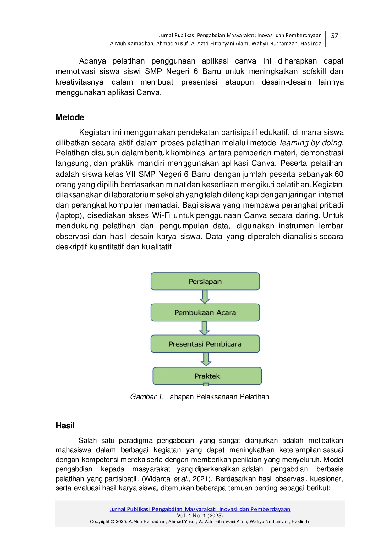 Jurnal Publikasi Pengabdian Masyarakat: Inovasi dan PemberdayaanJurnal Publikasi Pengabdian Masyarakat: Inovasi dan PemberdayaanDi era digital saat ini, penguasaan teknologi desain grafis menjadi salah satu keterampilan penting yang mendukung pengembangan softskill, seperti kreativitas, komunikasi, dan kerja tim. Hal tersebut masih banyak siswa yang belum familiar dengan aplikasi desain yang mudah diakses dan digunakan. Canva merupakan salah satu platform desain grafis berbasis digital yang praktis dan user-friendly, sehingga sangat cocok digunakan oleh pelajar. Pelatihan penggunaan Canva menjadi langkah strategis untuk membekali siswa dengan keterampilan yang relevan dan meningkatkan kesiapan mereka menghadapi tantangan di dunia pendidikan maupun dunia kerja. Penelitian ini bertujuan untuk menganalisis efektivitas pelatihan Canva dalam meningkatkan keterampilan kreatif dan digital siswa. Metode pelaksanaan meliputi beberapa tahap utama, yaitu persiapan, pembukaan acara, presentasi pembicara, dan sesi praktik. Hasil kegiatan menunjukkan bahwa pelatihan Canva memberikan dampak positif terhadap pengembangan keterampilan desain grafis siswa, meningkatkan kreativitas, serta memperkuat kemampuan berpikir kritis dan komunikasi visual. Pelatihan Canva terbukti berkontribusi dalam meningkatkan soft skill siswa, yang dapat mendukung kesiapan mereka dalam dunia pendidikan maupun pekerjaan di era digital.