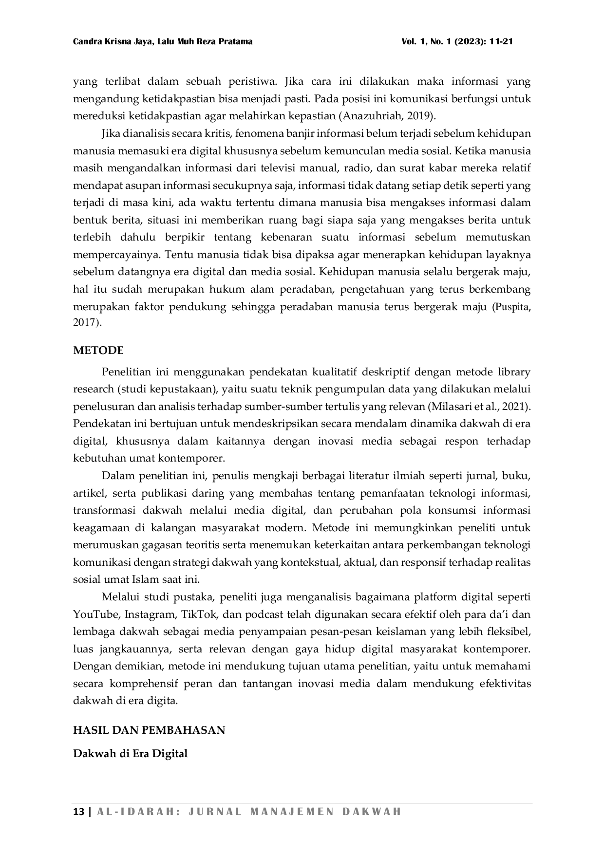 Al-Idarah: Jurnal Manajemen DakwahAl-Idarah: Jurnal Manajemen DakwahPenyebaran nilai-nilai keagamaan, khususnya dalam konteks dakwah, menghadapi tantangan dalam menjangkau khalayak luas melalui metode konvensional di era digital saat ini. Pemanfaatan teknologi digital dalam dakwah diharapkan dapat mengatasi keterbatasan ini, memberikan fleksibilitas, dan meningkatkan efektivitas dalam penyebaran pesan-pesan keagamaan. Dakwah digital menjadi inovasi yang dapat memperluas jangkauan dan memberikan kemudahan akses bagi masyarakat untuk memperoleh informasi agama secara lebih cepat dan terjangkau. Penelitian ini bertujuan untuk mengeksplorasi relevansi dakwah digital dalam memenuhi kebutuhan masyarakat modern. Metode yang digunakan dalam penelitian ini adalah library research, dengan pengumpulan data dari buku, jurnal, dan sumber-sumber daring yang relevan. Hasil penelitian menunjukkan bahwa dakwah digital dapat menjawab tantangan dakwah tradisional dengan menyediakan ruang interaktif bagi audiens, memungkinkan mereka untuk berinteraksi langsung dengan penceramah dan mengajukan pertanyaan. Inovasi ini terbukti efektif dalam memperluas cakupan dakwah, memberikan dampak positif dalam mempercepat proses pemahaman agama, serta memanfaatkan teknologi untuk penyebaran nilai-nilai keislaman yang lebih inklusif.