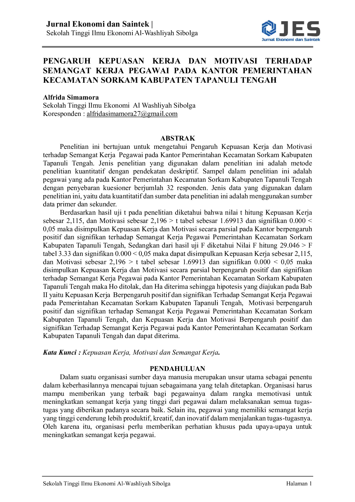 Penelitian selanjutnya dapat menginvestigasi peran moderasi gaya kepemimpinan terhadap hubungan antara kepuasan kerja, motivasi, dan semangat kerja, sehingga dapat mengungkap apakah tipe kepemimpinan tertentu memperkuat atau melemahkan pengaruh faktor-faktor tersebut. Selain itu, diperlukan studi longitudinal yang melacak perubahan kepuasan kerja, motivasi, dan semangat kerja selama periode beberapa tahun untuk memahami dinamika temporal dan faktor-faktor yang mempengaruhi stabilitas atau fluktuasi kinerja pegawai di lingkungan pemerintahan. Selanjutnya, perbandingan komparatif antara beberapa kantor pemerintahan kecamatan di provinsi yang berbeda dapat memberikan wawasan tentang variabel kontekstual regional, seperti kebijakan daerah atau budaya organisasi, yang mungkin memoderasi efek kepuasan kerja dan motivasi terhadap semangat kerja.