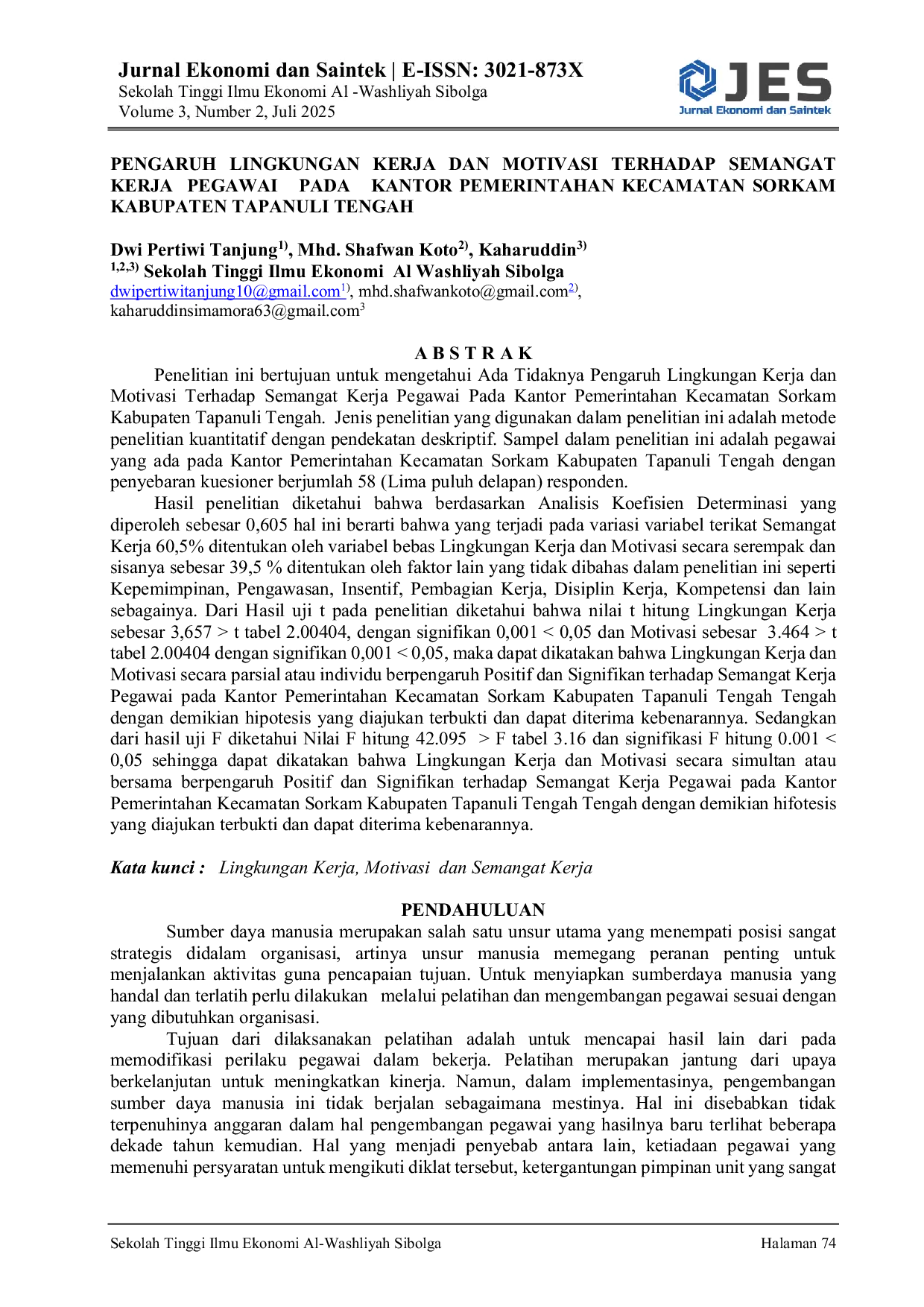 JURNAL EKONOMI & SAINSTEKJURNAL EKONOMI & SAINSTEKPenelitian ini bertujuan untuk mengetahui ada tidaknya . Jenis penelitian yang digunakan adalah metode penelitian kuantitatif dengan pendekatan deskriptif. Sampel dalam penelitian ini adalah pegawai yang ada pada Kantor Pemerintahan Kecamatan Sorkam Kabupaten Tapanuli Tengah dengan penyebaran kuesioner berjumlah 58 responden. Hasil penelitian diketahui bahwa berdasarkan analisis koefisien determinasi yang diperoleh sebesar 0,605, hal ini berarti bahwa variasi variabel terikat semangat kerja 60,5% ditentukan oleh variabel bebas lingkungan kerja dan motivasi secara serempak dan sisanya 39,5% ditentukan oleh faktor lain. Dari hasil uji t, lingkungan kerja dan motivasi secara parsial berpengaruh positif dan signifikan terhadap semangat kerja pegawai. Secara simultan, lingkungan kerja dan motivasi juga berpengaruh positif dan signifikan terhadap semangat kerja pegawai.