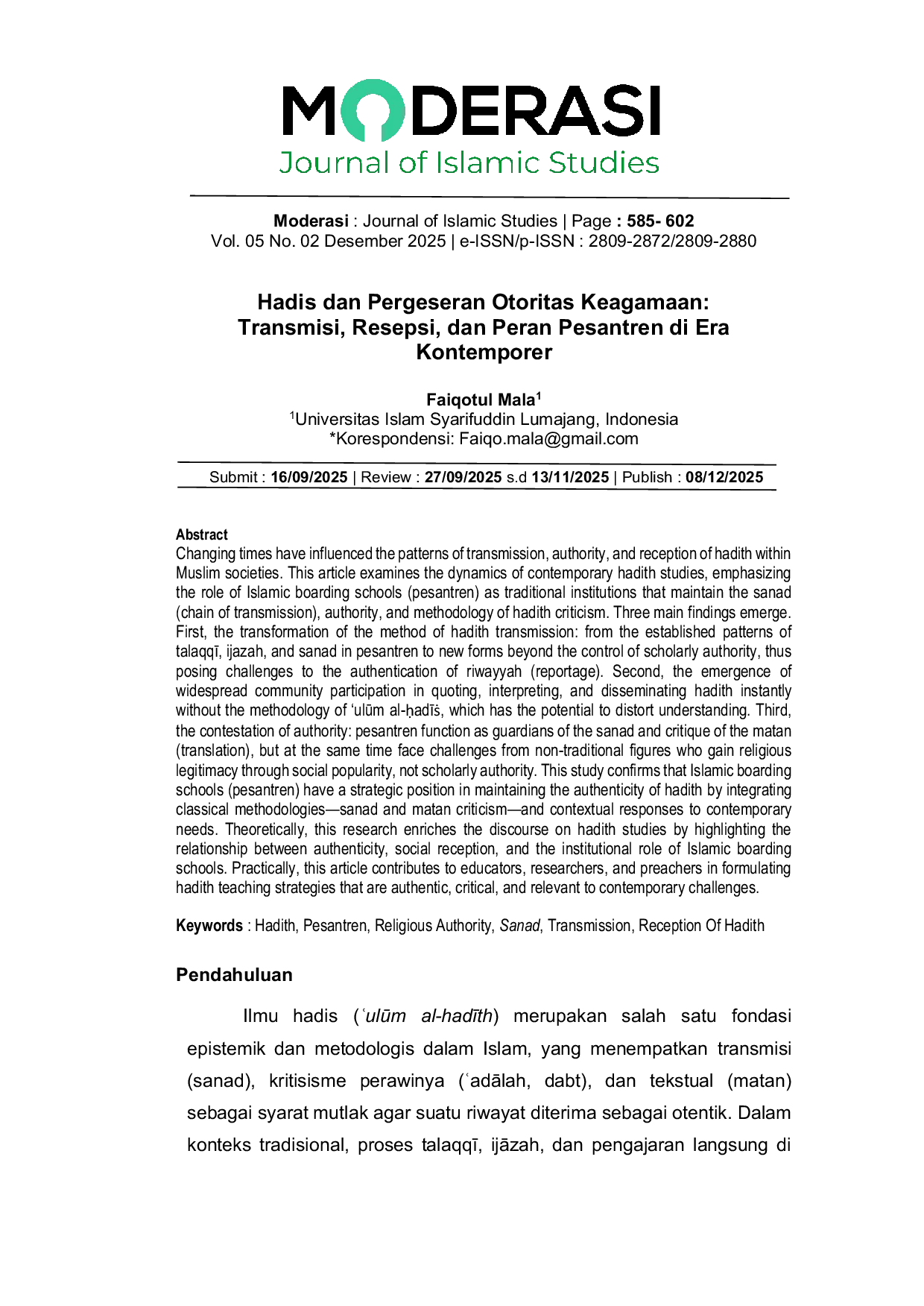 Moderasi : Journal of Islamic StudiesModerasi : Journal of Islamic StudiesPerubahan zaman telah memengaruhi pola transmisi, otoritas, dan penerimaan hadis dalam masyarakat Muslim. Artikel ini mengkaji dinamika studi hadis kontemporer, dengan menekankan peran pesantren sebagai lembaga tradisional yang memelihara sanad (rantai transmisi), otoritas, dan metodologi kritik hadis. Tiga temuan utama muncul. Pertama, transformasi metode transmisi hadis: dari pola-pola yang mapan dari talaqqī, ijazah, dan sanad di pesantren menjadi bentuk-bentuk baru di luar kendali otoritas ilmiah, sehingga menimbulkan tantangan bagi otentikasi riwayyah (pelaporan). Kedua, munculnya partisipasi masyarakat yang luas dalam mengutip, menafsirkan, dan menyebarluaskan hadis secara instan tanpa metodologi ulūm al-ḥadīṡ, yang berpotensi mendistorsi pemahaman. Ketiga, kontestasi otoritas: pesantren berfungsi sebagai penjaga sanad dan kritik matan (terjemahan), tetapi pada saat yang sama menghadapi tantangan dari figur non-tradisional yang memperoleh legitimasi agama melalui popularitas sosial, bukan otoritas ilmiah. Studi ini menegaskan bahwa pesantren memiliki posisi strategis dalam menjaga keaslian hadis dengan mengintegrasikan metodologi klasik—kritik sanad dan matan—dan respons kontekstual terhadap kebutuhan kontemporer. Secara teoritis, penelitian ini memperkaya wacana studi hadis dengan menyoroti hubungan antara keaslian, penerimaan sosial, dan peran institusional pesantren. Secara praktis, artikel ini berkontribusi kepada pendidik, peneliti, dan dai dalam merumuskan strategi pengajaran hadis yang otentik, kritis, dan relevan dengan tantangan kontemporer.