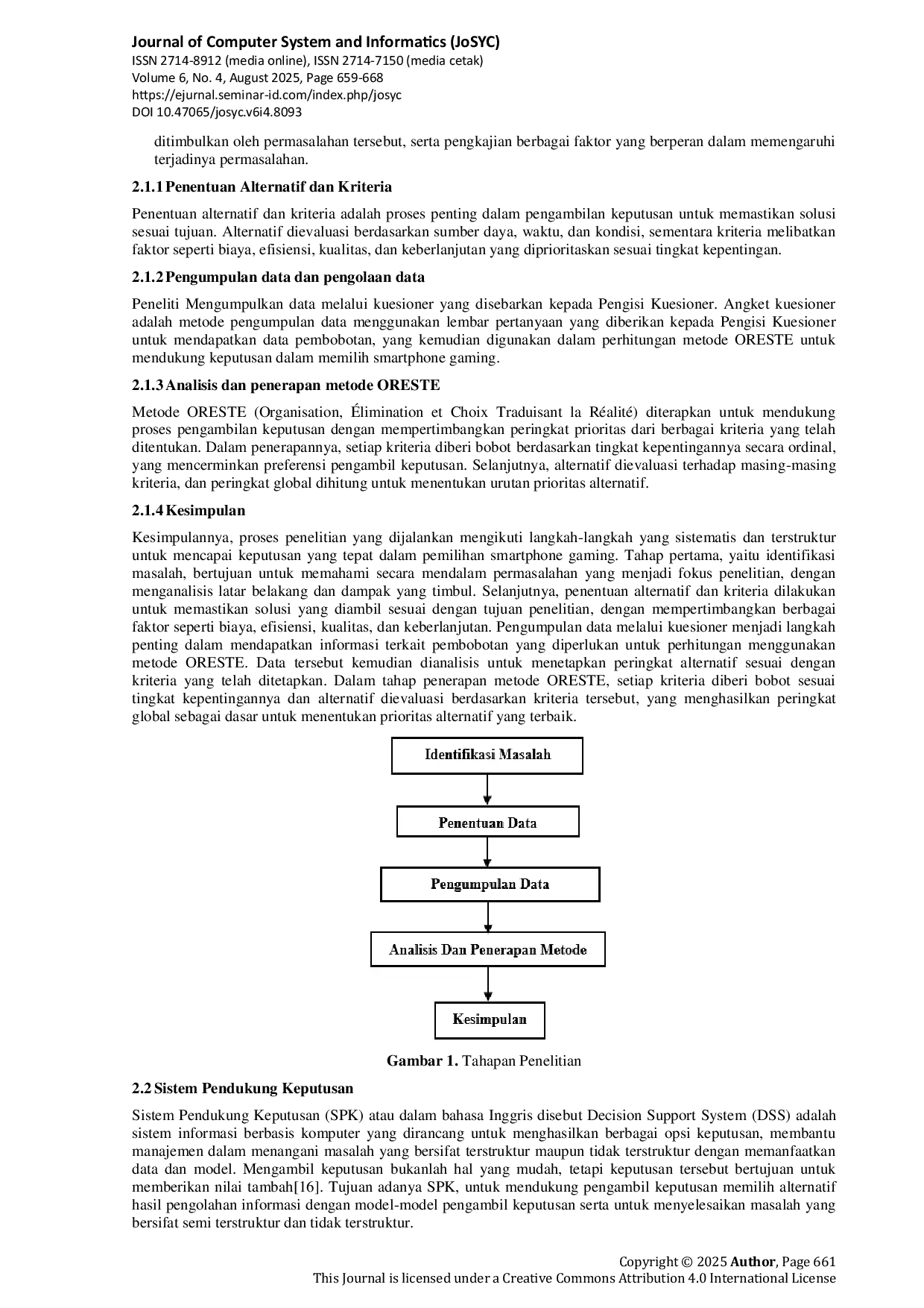 Journal of Computer System and Informatics (JoSYC)Journal of Computer System and Informatics (JoSYC)Penelitian ini bertujuan untuk membantu konsumen dalam memilih smartphone gaming kelas menengah terbaik dengan menggunakan metode ORESTE (Organisation, Élimination et Choix Traduisant la Réalité). Metode ini diterapkan untuk memberikan rekomendasi berbasis kriteria-kriteria penting, seperti performa prosesor, kapasitas RAM, kualitas layar, daya tahan baterai, dan harga. Tahap pertama dari penelitian ini adalah identifikasi masalah yang berfokus pada pemilihan smartphone gaming terbaik di kelas menengah. Selanjutnya, dilakukan penentuan alternatif dan kriteria yang relevan, diikuti dengan pengumpulan data menggunakan kuesioner yang dibagikan kepada 78 responden. Data yang terkumpul kemudian dianalisis menggunakan metode ORESTE untuk menghitung peringkat global dari masing-masing alternatif. Hasil analisis menunjukkan bahwa smartphone Samsung menempati posisi pertama sebagai pilihan terbaik berdasarkan peringkat yang diperoleh dari setiap kriteria. Penggunaan metode ORESTE memungkinkan sistematisasi dalam pengambilan keputusan, dengan mempertimbangkan bobot dan prioritas kriteria yang relevan. Penelitian ini memberikan kontribusi dalam membantu konsumen membuat keputusan yang lebih objektif dan terarah dalam memilih smartphone gaming yang sesuai dengan kebutuhan dan preferensi mereka. Selain itu, penelitian ini juga diharapkan dapat menjadi referensi bagi produsen smartphone dalam memahami preferensi konsumen dan meningkatkan kualitas produk mereka. Dengan demikian, hasil penelitian ini tidak hanya bermanfaat bagi konsumen, tetapi juga bagi industri smartphone secara keseluruhan.
