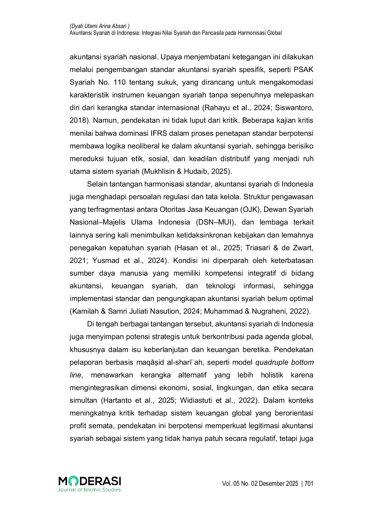 Moderasi : Journal of Islamic StudiesModerasi : Journal of Islamic StudiesArtikel ini mengkaji akuntansi syariah di Indonesia sebagai sistem normatif‑hibrida yang terbentuk melalui integrasi maqāṣid al‑sharīʿah, ideologi Pancasila, dan tekanan harmonisasi standar global. Menggunakan tinjauan literatur integratif, penelitian mensintesis kajian konseptual, empiris, dan normatif‑legal untuk menelaah interaksi antara nilai syariah, nilai kebangsaan, serta standar Internasional Financial Reporting Standards (IFRS). Temuan menunjukkan bahwa akuntansi syariah Indonesia tidak dapat dijelaskan semata dengan perspektif teknokratis atau religio‑sentris; ia berfungsi sebagai sistem normatif kontekstual di mana etika Islam dan Pancasila menjadi logika inti, sementara IFRS, mekanisme tata kelola, pelaporan keberlanjutan, dan digitalisasi berperan sebagai instrumen adaptif. Penelitian ini mengidentifikasi tantangan seperti harmonisasi IFRS yang parsial, fragmentasi regulasi, serta risiko kepatuhan formalistik yang melemahkan tujuan etis dan sosial, kemudian mengusulkan model Akuntansi Syariah Normatif‑Hibrida Kontekstual Indonesia (ASNHK‑I) sebagai kerangka konseptual baru.