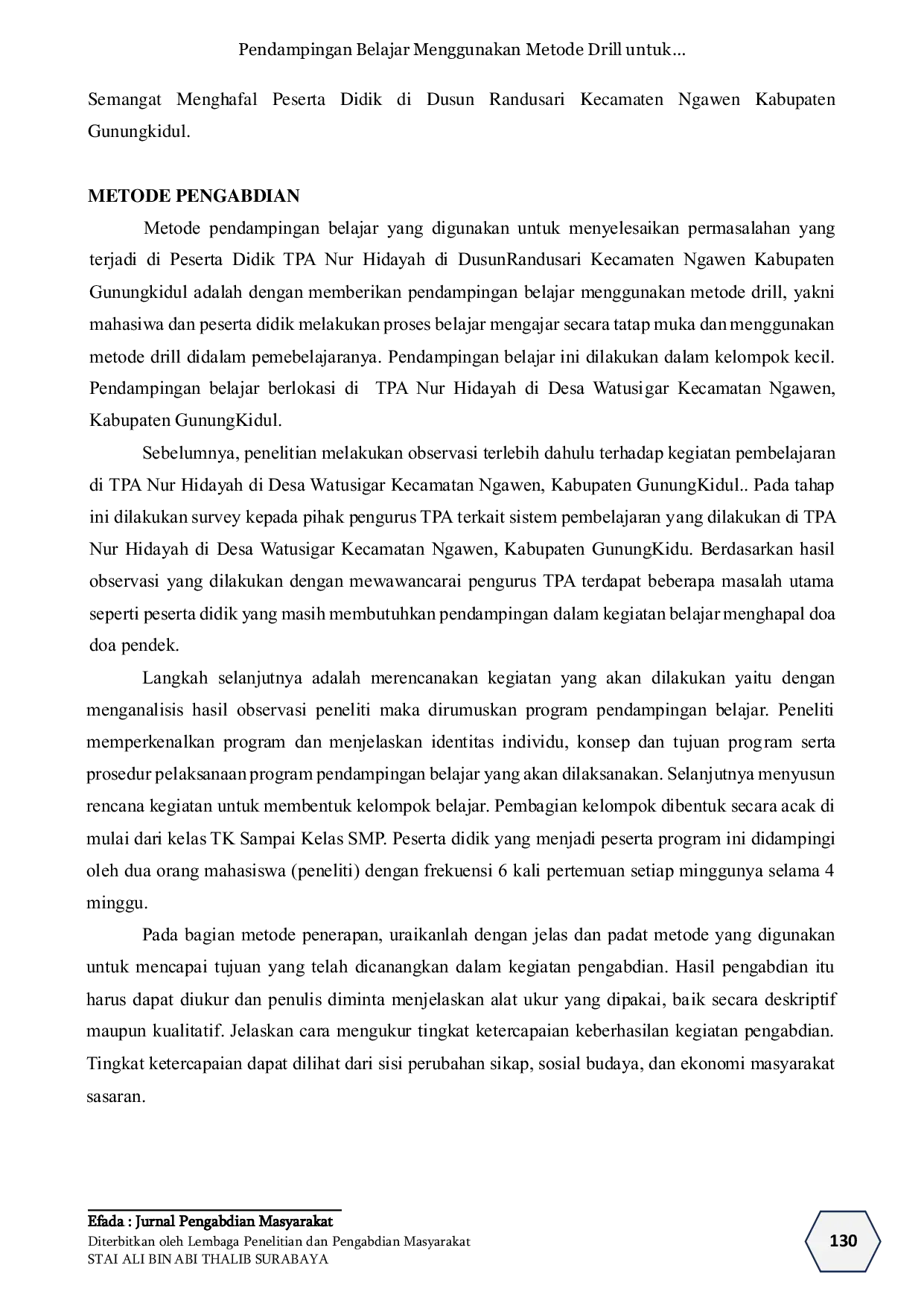 Pendampingan belajar menggunakan metode drill didalam menghalal doa kecil di TPA Nur Hidayah di Desa Watusigar Kecamatan Ngawen, Kabupaten Gunungkidul merupakan pengabdian masyarakat di bidang pendidikan sebagai salah satu upaya dalam melaksanakan tri dharma perguruan tinggi.Proses pendampingan belajar menggunakan metode drill ini untuk meningkatkan hapalan doa pendek di TPA Nur Hidayah dilakukan selama empat minggu di Desa Watusigar Kecamatan Ngawen, Kabupaten Gunungkidul berjalan dengan baik dan lancar.