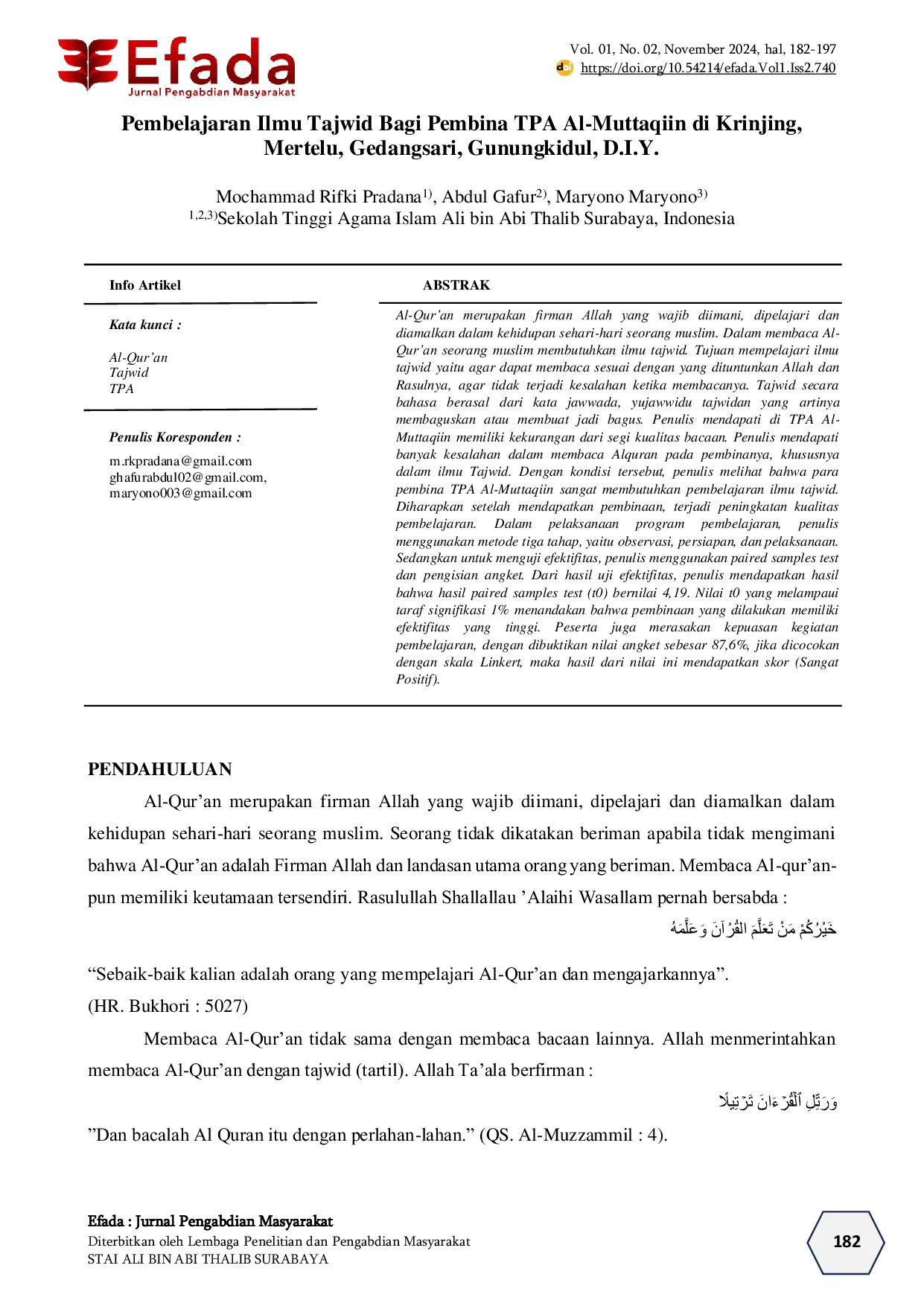 Efada : Jurnal Pengabdian MasyarakatEfada : Jurnal Pengabdian MasyarakatAl-Quran merupakan firman Allah yang wajib diimani, dipelajari dan diamalkan dalam kehidupan sehari-hari seorang muslim. Dalam membaca Al-Quran seorang muslim membutuhkan ilmu tajwid. Tujuan mempelajari ilmu tajwid yaitu agar dapat membaca sesuai dengan yang dituntunkan Allah dan Rasulnya, agar tidak terjadi kesalahan ketika membacanya. Tajwid secara bahasa berasal dari kata jawwada, yujawwidu tajwidan yang artinya membaguskan atau membuat jadi bagus. Penulis mendapati di TPA Al-Muttaqiin memiliki kekurangan dari segi kualitas bacaan. Penulis mendapati banyak kesalahan dalam membaca Alquran pada pembinanya, khususnya dalam ilmu Tajwid. Dengan kondisi tersebut, penulis melihat bahwa para pembina TPA Al-Muttaqiin sangat membutuhkan pembelajaran ilmu tajwid. Diharapkan setelah mendapatkan pembinaan, terjadi peningkatan kualitas pembelajaran. Dalam pelaksanaan program pembelajaran, penulis menggunakan metode tiga tahap, yaitu observasi, persiapan, dan pelaksanaan. Sedangkan untuk menguji efektifitas, penulis menggunakan paired samples test dan pengisian angket. Dari hasil uji efektifitas, penulis mendapatkan hasil bahwa hasil paired samples test (t0) bernilai 4,19. Nilai t0 yang melampaui taraf signifikasi 1% menandakan bahwa pembinaan yang dilakukan memiliki efektifitas yang tinggi. Peserta juga merasakan kepuasan kegiatan pembelajaran, dengan dibuktikan nilai angket sebesar 87,6%, jika dicocokan dengan skala Linkert, maka hasil dari nilai ini mendapatkan skor (Sangat Positif).