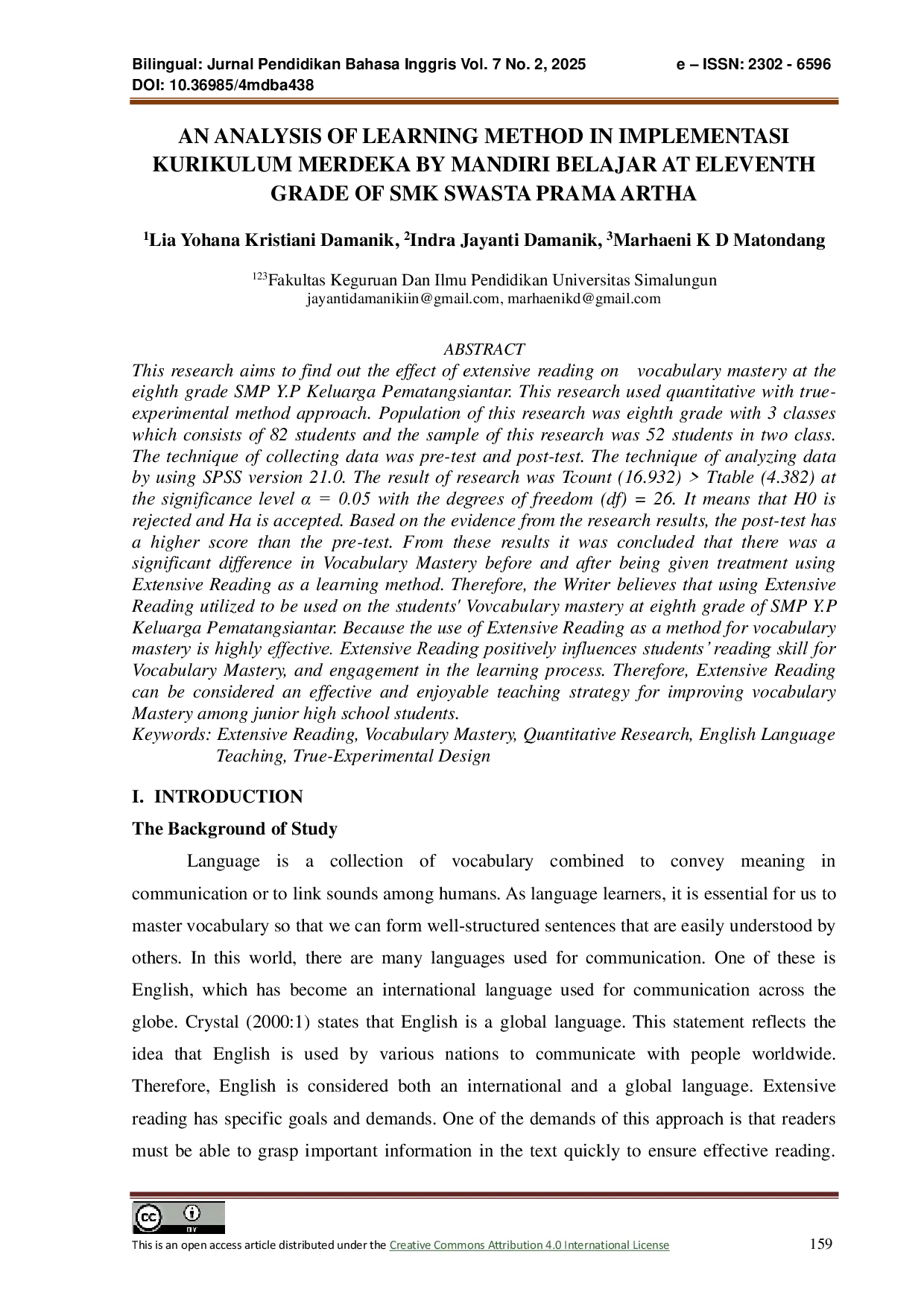 Bilingual : Jurnal Pendidikan Bahasa InggrisBilingual : Jurnal Pendidikan Bahasa InggrisPenelitian ini bertujuan untuk mengetahui pengaruh metode Extensive Reading terhadap penguasaan kosakata siswa kelas delapan SMP Y.P Keluarga Pematangsiantar. Penelitian ini menggunakan pendekatan kuantitatif dengan metode eksperimen. Hasil penelitian menunjukkan bahwa terdapat perbedaan signifikan antara skor pre-test dan post-test siswa yang menggunakan metode Extensive Reading.