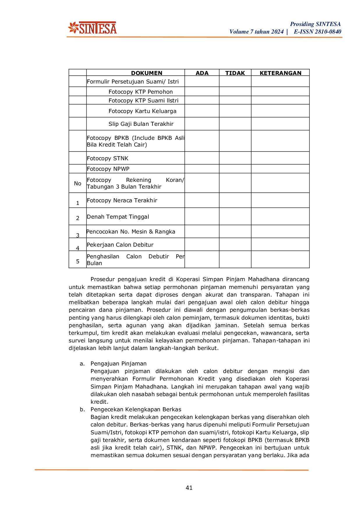 Seminar Ilmiah Nasional Teknologi, Sains, dan Sosial Humaniora (SINTESA)Seminar Ilmiah Nasional Teknologi, Sains, dan Sosial Humaniora (SINTESA)Penilitian ini bertujuan untuk menganalisis prosedur pengajuan kredit di Koperasi Simpan Pinjam (KSP) Mahadhana sebagai upaya meningkatkan pelayanan kredit yang efektif dan meminimalkan risiko kredit bermasalah.