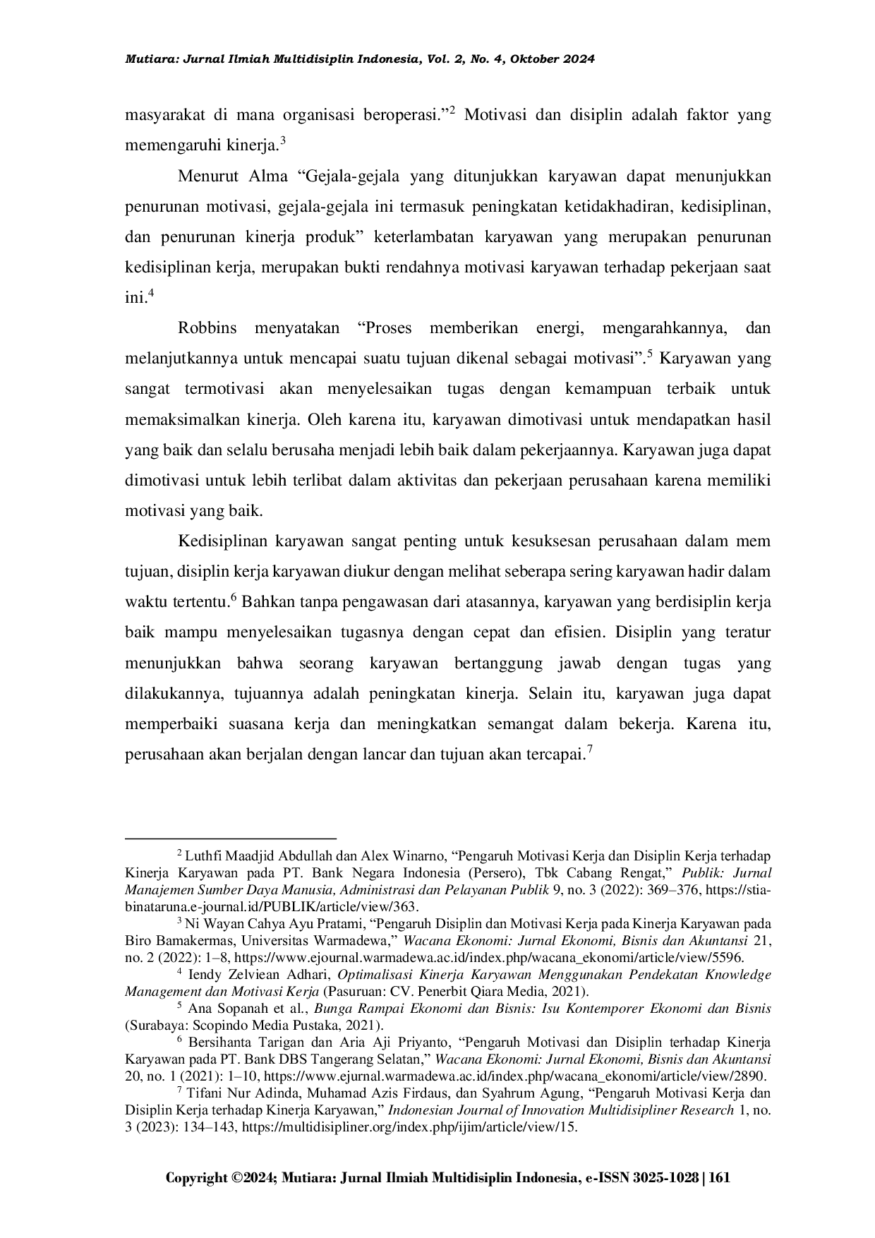 Mutiara: Jurnal Ilmiah Multidisiplin IndonesiaMutiara: Jurnal Ilmiah Multidisiplin IndonesiaTujuan dilakukannya riset kuantitatif ini untuk menganalisis sejauh mana pengaruh motivasi dan disiplin terhadap kinerja karyawan Extrusion Blow PT. Jayatama Selaras. Metode penghimpunan data mengaplikasikan kuesioner yang dibagikan kepada responden. Peneliti pada riset ini menggunakan analisis kuantitatif seperti uji validitas dan reliabilitas, uji asumsi klasik, analisis regresi linier berganda, uji hipotesis, dan uji koefisien determinasi. Semua analisis ini dilakukan menggunakan SPSS versi 25. Penelitian ini melibatkan seluruh karyawan Extrusion Blow PT. Jayatama Selaras, yang berjumlah 50 responden. Metode sampel jenuh digunakan untuk menentukan sampel. Hasil penelitian menunjukkan bahwa dengan koefisien regresi sebesar 2,145 ≥ 1,677, motivasi secara parsial berpengaruh signifikan terhadap kinerja karyawan. Dengan koefisien regresi sebesar 12,914 ≥ 1,677 disiplin secara parsial berpengaruh terhadap kinerja karyawan. Ditunjukkan bahwa motivasi dan disiplin berpengaruh secara simultan terhadap kinerja karyawan, dengan Fhitung 256,961 ≥ Ftabel 3,195, dan nilai signifikansi setiap variabel ≤ 0,05. Uji koefisien determinasi membuktikan motivasi dan disiplin memengaruhi kinerja karyawan sebesar 95,7%, sedangkan 4,3% faktor yang tidak terlibat pada riset ini.