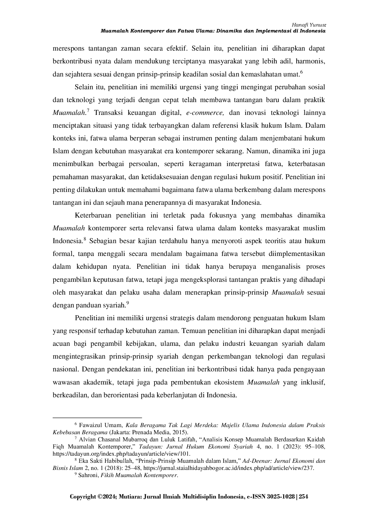Mutiara: Jurnal Ilmiah Multidisiplin IndonesiaMutiara: Jurnal Ilmiah Multidisiplin IndonesiaPenelitian ini bertujuan untuk mengkaji dinamika fatwa ulama dalam menghadapi isu-isu Muamalah kontemporer di Indonesia dan mengidentifikasi peran serta tantangan dalam implementasinya, serta potensi penyelarasan antara fatwa dan regulasi hukum positif. Fatwa ulama memiliki peran krusial dalam memberikan pedoman hukum Islam bagi umat Islam di Indonesia, terutama dalam konteks perkembangan teknologi dan ekonomi modern, seperti e-commerce, fintech syariah, dan investasi digital. Melalui pendekatan kualitatif dengan studi pustaka, penelitian ini menganalisis berbagai fatwa yang dikeluarkan oleh Majelis Ulama Indonesia (MUI) serta faktor-faktor yang mempengaruhi keputusan ulama dalam mengeluarkan fatwa, termasuk perkembangan teknologi, kebutuhan masyarakat, dan globalisasi. Selain itu, penelitian ini juga mengidentifikasi hambatan dalam implementasi fatwa, seperti pemahaman masyarakat yang terbatas dan potensi konflik dengan regulasi pemerintah. Penelitian ini menemukan bahwa meskipun terdapat tantangan, terdapat potensi besar untuk menyelaraskan fatwa ulama dengan regulasi hukum positif di Indonesia. Kolaborasi antara ulama, lembaga keagamaan, dan pemerintah sangat penting untuk memastikan implementasi fatwa yang efektif, serta menciptakan sistem hukum yang inklusif dan adil bagi umat Islam. Sinergi antara fatwa dan regulasi diharapkan dapat mendukung perkembangan ekonomi syariah yang berkelanjutan dan memberikan kontribusi pada pembangunan masyarakat Indonesia yang lebih sejahtera dan harmonis.
