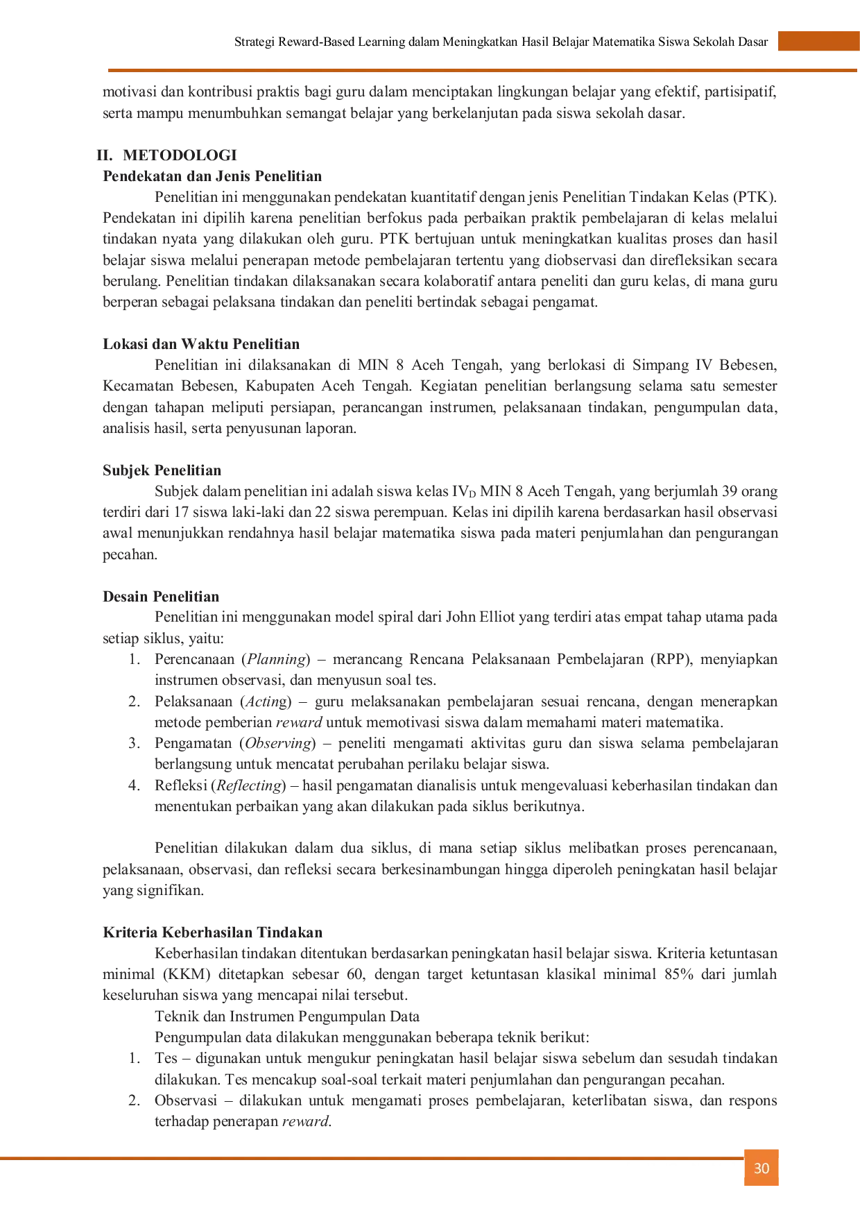 Ta'dib: Jurnal Pemikiran PendidikanTa'dib: Jurnal Pemikiran PendidikanProses pembelajaran di sekolah memerlukan pengelolaan kelas yang efektif dan pemilihan metode pembelajaran yang tepat. Penelitian ini bertujuan untuk mengetahui apakah pemberian reward dapat meningkatkan hasil belajar matematika siswa kelas IVD di MIN 8 Aceh Tengah serta mengidentifikasi kendala yang dihadapi guru dalam penerapannya. Penelitian ini menggunakan Penelitian Tindakan Kelas (PTK) dengan 39 siswa sebagai subjek penelitian. Data dikumpulkan melalui observasi, tes hasil belajar, dan wawancara. Hasil penelitian menunjukkan bahwa penerapan metode pemberian reward dapat meningkatkan hasil belajar siswa pada materi penjumlahan dan pengurangan pecahan, dari 20% pada pra-siklus menjadi 85% pada siklus II. Dapat disimpulkan bahwa pemberian reward berpengaruh positif terhadap peningkatan hasil belajar siswa, meskipun guru masih menghadapi kendala dalam konsistensi pemberian penghargaan dan pengelolaan waktu pembelajaran.