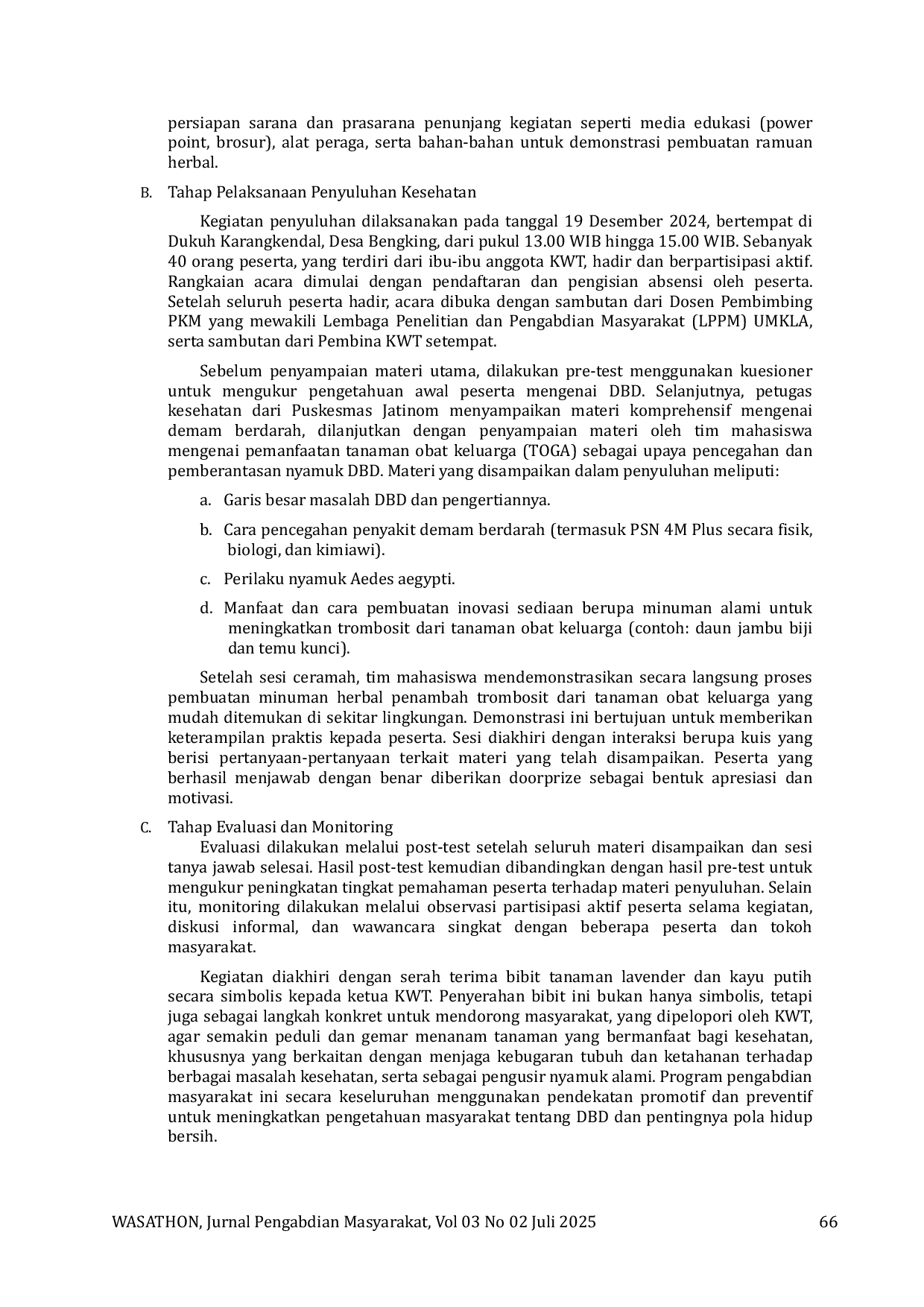 WASATHON Jurnal Pengabdian MasyarakatWASATHON Jurnal Pengabdian MasyarakatDemam Berdarah Dengue (DBD) merupakan masalah kesehatan yang signifikan di Desa Bengking, Kecamatan Jatinom, khususnya pada musim hujan, dipicu oleh rendahnya kesadaran masyarakat dalam pemberantasan sarang nyamuk. Kegiatan pengabdian masyarakat ini bertujuan memberdayakan Kelompok Wanita Tani (KWT) Desa Bengking melalui peningkatan pengetahuan dan praktik pencegahan DBD, utamanya melalui pemanfaatan tanaman obat keluarga (TOGA) dan pelaksanaan Pemberantasan Sarang Nyamuk (PSN) 4M Plus. Sebanyak 40 anggota KWT berpartisipasi aktif dalam kegiatan ini. Hasil pre-test dan post-test menunjukkan peningkatan signifikan pada pengetahuan peserta terkait bahaya DBD, siklus hidup nyamuk, gejala, serta strategi pencegahan dan penanganan. Keberhasilan program ini terbukti dari komitmen masyarakat untuk melakukan gerakan kebersihan lingkungan dan mengkonsumsi ramuan herbal, yang secara kolektif diharapkan dapat mengurangi insiden DBD dan meningkatkan kualitas kesehatan masyarakat Desa Bengking secara berkelanjutan.
