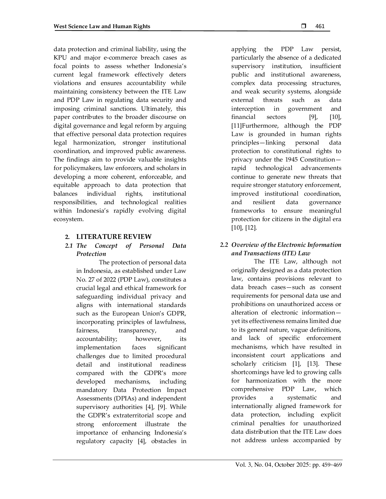West Science Law and Human RightsWest Science Law and Human RightsStudi ini memeriksa tanggung jawab pidana atas pelanggaran data pribadi di Indonesia melalui analisis normatif yuridis studi kasus yang melibatkan Komisi Pemilihan Umum (KPU) dan platform e-commerce selama periode 2023–2024. Penelitian fokus pada keterkaitan antara Undang-Undang Informasi Elektronik dan Transaksi (UU ITE) dan Undang-Undang Perlindungan Data Pribadi (UU PDP) untuk menentukan bagaimana regulasi tersebut mengatur perlindungan data pribadi serta pelaksanaan sanksi pidana. Hasil menunjukkan bahwa UU ITE menyediakan dasar hukum untuk menangani kejahatan elektronik tetapi kurang spesifik dalam menangani kasus kelalaian institusional dan tanggung jawab perusahaan, sementara UU PDP memberikan ketentuan menyeluruh tetapi menghadapi kesulitan pelaksanaan karena kapasitas institusional terbatas dan yurisdiksi tumpang tindih. Analisis kasus menunjukkan lemahnya penerapan hukum, kurangnya akuntabilitas, dan kesadaran publik terbatas. Studi ini menyimpulkan bahwa perlindungan data pribadi yang efektif di Indonesia memerlukan harmonisasi hukum antara UU ITE dan UU PDP, pembentukan otoritas pengawas, serta peningkatan kapasitas institusi dan publik.