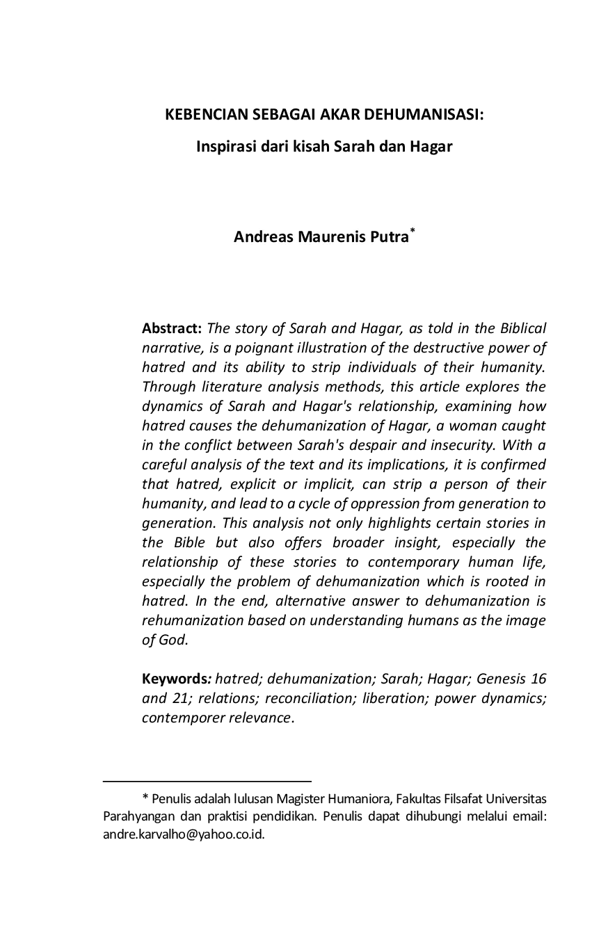 Jurnal Amanat AgungJurnal Amanat AgungKisah Sarah dan Hagar, sebagaimana diceritakan dalam narasi Alkitab, merupakan ilustrasi yang tajam tentang kekuatan destruktif dari kebencian dan kemampuannya untuk melucuti kemanusiaan individu. Melalui metode analisis pustaka, artikel ini mengeksplorasi dinamika hubungan Sarah dan Hagar, mengkaji bagaimana kebencian menyebabkan dehumanisasi Hagar, seorang perempuan yang terjebak dalam konflik antara keputusasaan dan ketidakamanan Sarah. Dengan analisis yang cermat terhadap teks tersebut dan implikasinya, ditegaskan bahwa kebencian, secara eksplisit maupun implisit, dapat melucuti kemanusiaan seseorang, dan berujung pada siklus penindasan dari generasi ke generasi. Analisis ini tidak hanya menyoroti kisah-kisah tertentu dalam Alkitab tetapi juga menawarkan wawasan yang lebih luas, terutama kaitan kisah ini dengan kehidupan manusia kontemporer terutama persoalan dehumanisasi yang berakar pada kebencian. Pada akhirnya, alternatif jawaban untuk dehumanisasi adalah rehumanisasi berbasis pemahaman manusia sebagai citra Allah.
