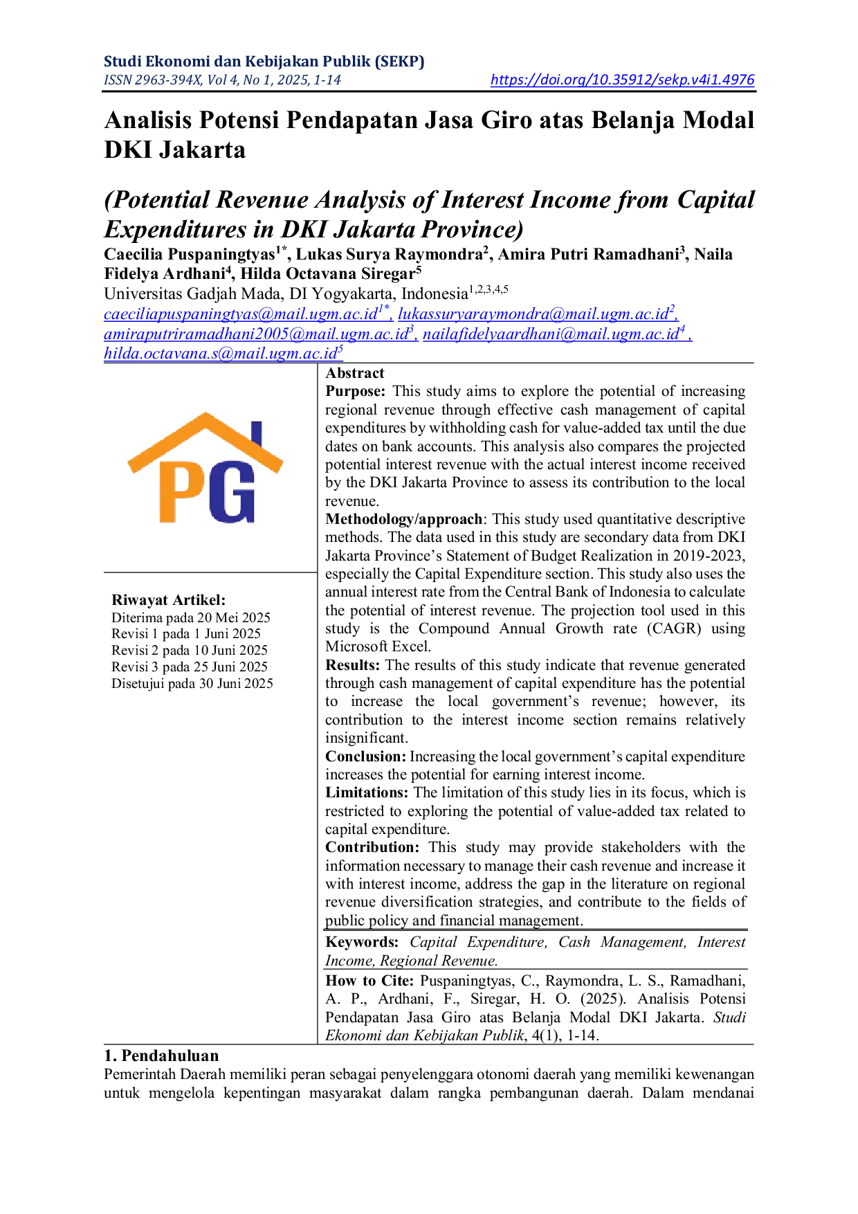 Kenaikan belanja modal DKI Jakarta meningkatkan potensi pendapatan jasa giro melalui manajemen kas.Namun, kontribusi pendapatan jasa giro ini relatif kecil terhadap total pendapatan daerah.Penelitian ini membuka peluang optimasi kebijakan manajemen kas untuk diversifikasi pendapatan daerah.