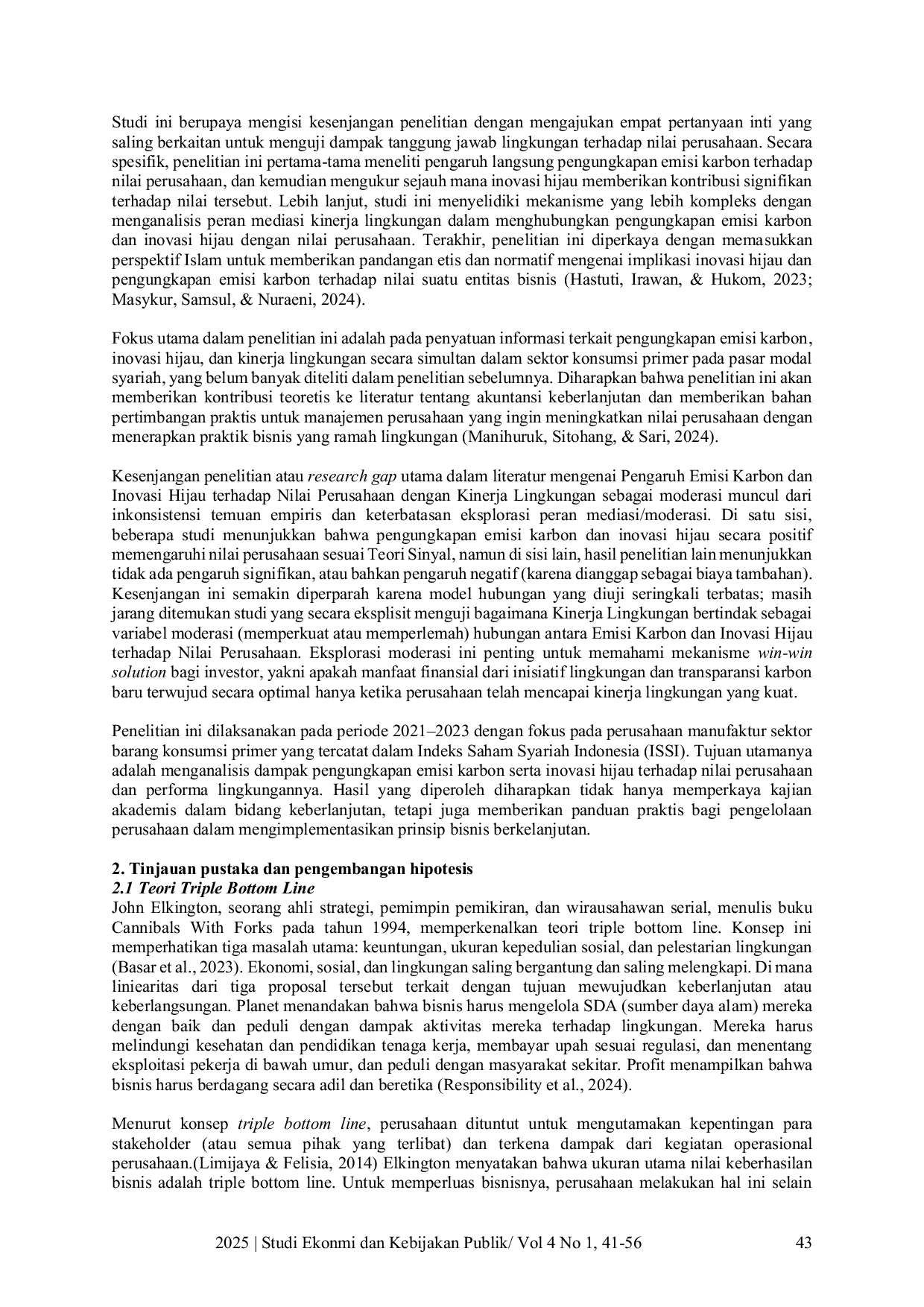 Studi Ekonomi dan Kebijakan PublikStudi Ekonomi dan Kebijakan PublikPenelitian ini bertujuan untuk mengeksplorasi pengaruh emisi karbon dan inovasi hijau terhadap nilai perusahaan, dengan mempertimbangkan kinerja lingkungan sebagai faktor moderasi. Penelitian ini menggunakan metodologi kuantitatif dengan sumber data sekunder dari laporan keberlanjutan dan laporan tahunan perusahaan manufaktur yang termasuk dalam Indeks Saham Syariah Indonesia (ISSI) untuk tahun 2021–2023. Hasil penelitian menunjukkan bahwa nilai perusahaan dipengaruhi oleh tingkat pengungkapan terkait emisi karbon dan inovasi hijau. Namun, kinerja lingkungan tidak berfungsi sebagai faktor moderasi dalam hubungan antara pengungkapan emisi karbon, inovasi hijau, dan nilai perusahaan. Temuan ini mengimplikasikan bahwa inisiatif bisnis untuk meningkatkan kinerja lingkungan belum cukup meyakinkan investor untuk mengubah persepsi mereka terhadap risiko atau manfaat yang terkait dengan pengungkapan emisi karbon dan inovasi hijau.