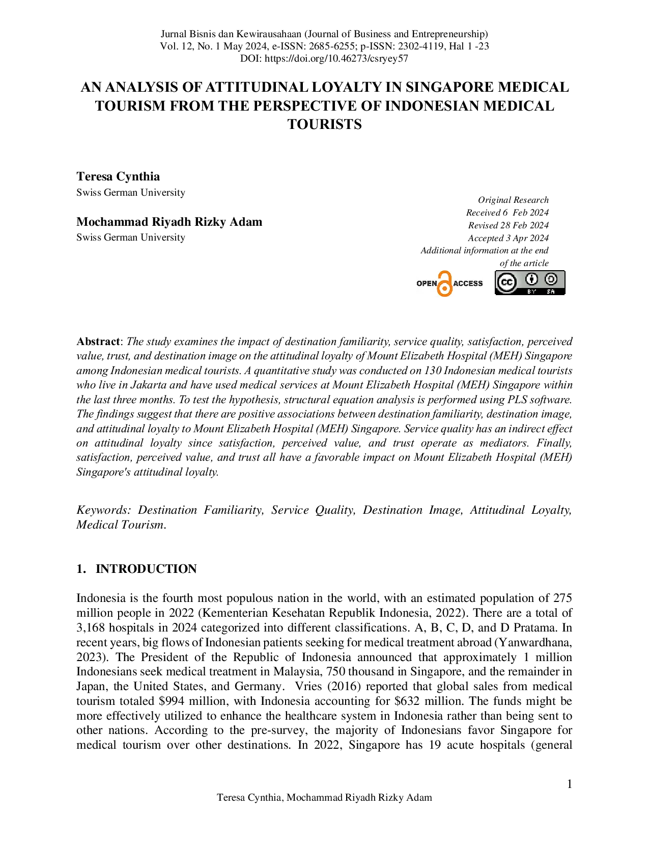 Journal of Business And EntrepreneurshipJournal of Business And EntrepreneurshipPenelitian ini menyelidiki dampak dari familiaritas destinasi, kualitas layanan, kepuasan, nilai yang dirasakan, kepercayaan, dan citra destinasi terhadap loyalitas sikap Rumah Sakit Mount Elizabeth (MEH) Singapura di kalangan wisatawan medis Indonesia. Sebuah studi kuantitatif dilakukan terhadap 130 wisatawan medis Indonesia yang tinggal di Jakarta dan telah menggunakan layanan medis di Rumah Sakit Mount Elizabeth (MEH) Singapura dalam tiga bulan terakhir. Untuk menguji hipotesis, analisis persamaan struktural dilakukan menggunakan perangkat lunak PLS. Temuan menunjukkan adanya asosiasi positif antara familiaritas destinasi, citra destinasi, dan loyalitas sikap terhadap Rumah Sakit Mount Elizabeth (MEH) Singapura. Kualitas layanan memiliki efek tidak langsung pada loyalitas sikap karena kepuasan, nilai yang dirasakan, dan kepercayaan berfungsi sebagai mediator. Akhirnya, kepuasan, nilai yang dirasakan, dan kepercayaan semua memiliki dampak positif terhadap loyalitas sikap Rumah Sakit Mount Elizabeth (MEH) Singapura.