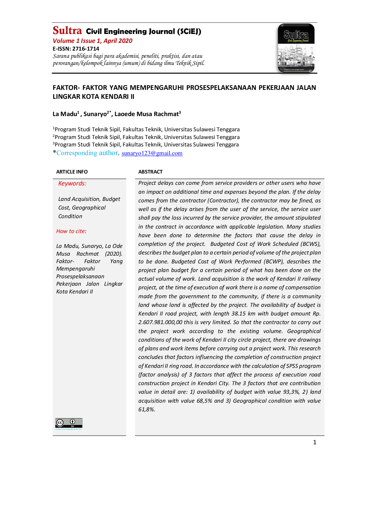 Sultra Civil Engineering Journal (SCiEJ)Sultra Civil Engineering Journal (SCiEJ)Penelitian ini bertujuan untuk mengetahui faktor-faktor yang mempengaruhi proses pelaksanaan pekerjaan jalan lingkar kota Kendari II. Penelitian ini menggunakan metode survei dengan teknik pengumpulan data melalui kuesioner yang disebarkan kepada 30 responden yang terdiri dari tim pembebasan lahan, pengguna anggaran, rekanan, dan konsultan. Hasil penelitian menunjukkan bahwa faktor-faktor yang mempengaruhi proses pelaksanaan pekerjaan jalan lingkar kota Kendari II adalah ketersediaan anggaran, pembebasan lahan, dan kondisi geografis.