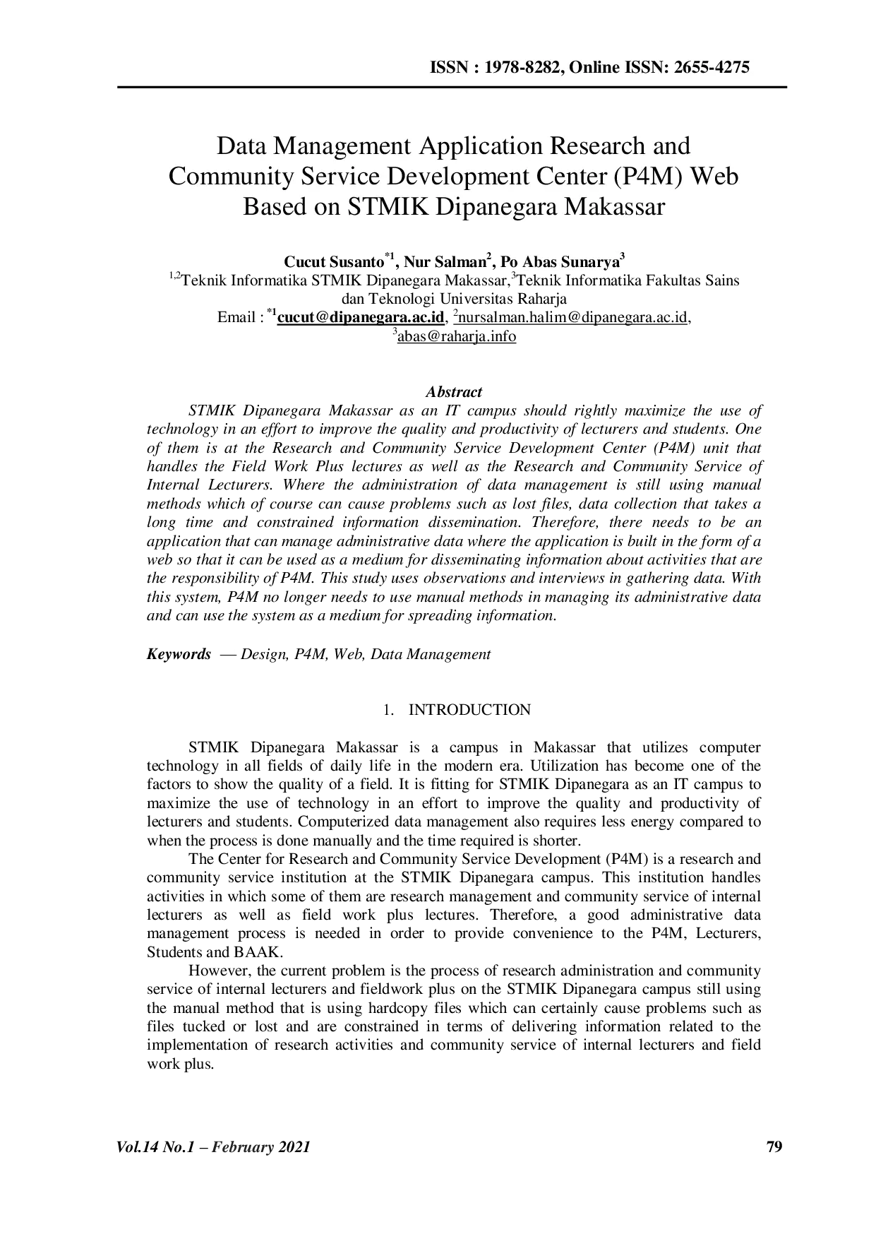 CCIT (Creative Communication and Innovative Technology) JournalCCIT (Creative Communication and Innovative Technology) JournalSTMIK Dipanegara Makassar sebagai kampus IT selayaknya memaksimalkan penggunaan teknologi dalam upaya meningkatkan kualitas dan produktivitas dosen dan mahasiswa. Salah satunya adalah pada unit Pusat Penelitian dan Pengembangan Pengabdian kepada Masyarakat (P4M) yang menangani kuliah Kerja Lapangan Plus serta Penelitian dan Pengabdian kepada Masyarakat Dosen Internal. Di mana administrasi pengelolaan data masih menggunakan metode manual yang tentu saja dapat menimbulkan masalah seperti hilangnya berkas, pengumpulan data yang memakan waktu lama dan terhambatnya penyebaran informasi. Oleh karena itu, perlu adanya aplikasi yang dapat mengelola data administrasi di mana aplikasi tersebut dibangun dalam bentuk web sehingga dapat digunakan sebagai media penyebaran informasi mengenai kegiatan yang menjadi tanggung jawab P4M. Penelitian ini menggunakan observasi dan wawancara dalam pengumpulan data. Dengan sistem ini, P4M tidak lagi perlu menggunakan metode manual dalam mengelola data administrasinya dan dapat menggunakan sistem sebagai media penyebaran informasi.
