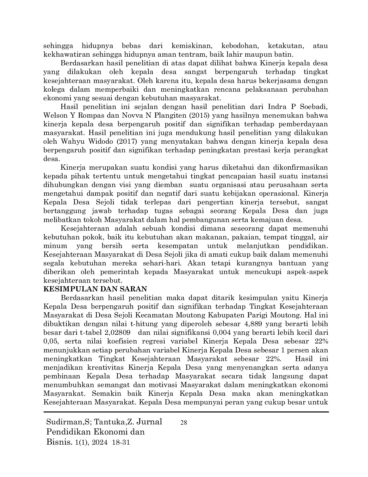Jurnal Pendidikan Ekonomi dan BisnisJurnal Pendidikan Ekonomi dan BisnisPenelitian ini bertujuan untuk mengetahui Pengaruh di Desa Sejoli Kecamatan Moutong Kabupaten Parigi Moutong. Metode penelitian yang digunakan dalam penelitian ini adalah metode kuantitatif korelasional dengan pendekatan kuantitatif deskriptif. Data yang digunakan adalah data primer yang diperoleh dari penyebaran kuesioner kepada Masyarakat di Desa Sejoli Kecamatan Moutong Kabupaten Parigi Moutong. Penarikan sampel dalam penelitian ini sebesar 20% dari jumlah populasi dengan jumlah sampel dalam penelitian ini berjumlah 38 responden dengan teknik pengambilan sampel yaitu teknik Stratified random sampling. Analisis data dalam penelitian ini menggunakan analisis regresi linier sederhana dengan bantuan program SPSS 26. Hasil penelitian menunjukan Kinerja Kepala Desa berpengaruh positif dan signifikan terhadap tingkat kesejahteraan Masyarakat, yang berarti semakin baik Kinerja Kepala Desa yang dilakukan maka kesejahteraan Masyarakat akan meningkat. Koefisien determinasi dalam penelitian ini sebesar 22%. yang berarti variabilitas tingkat kesejahteraan masyarakat dapat dijelaskan oleh Kinerja kepala desa sebesar 22%.