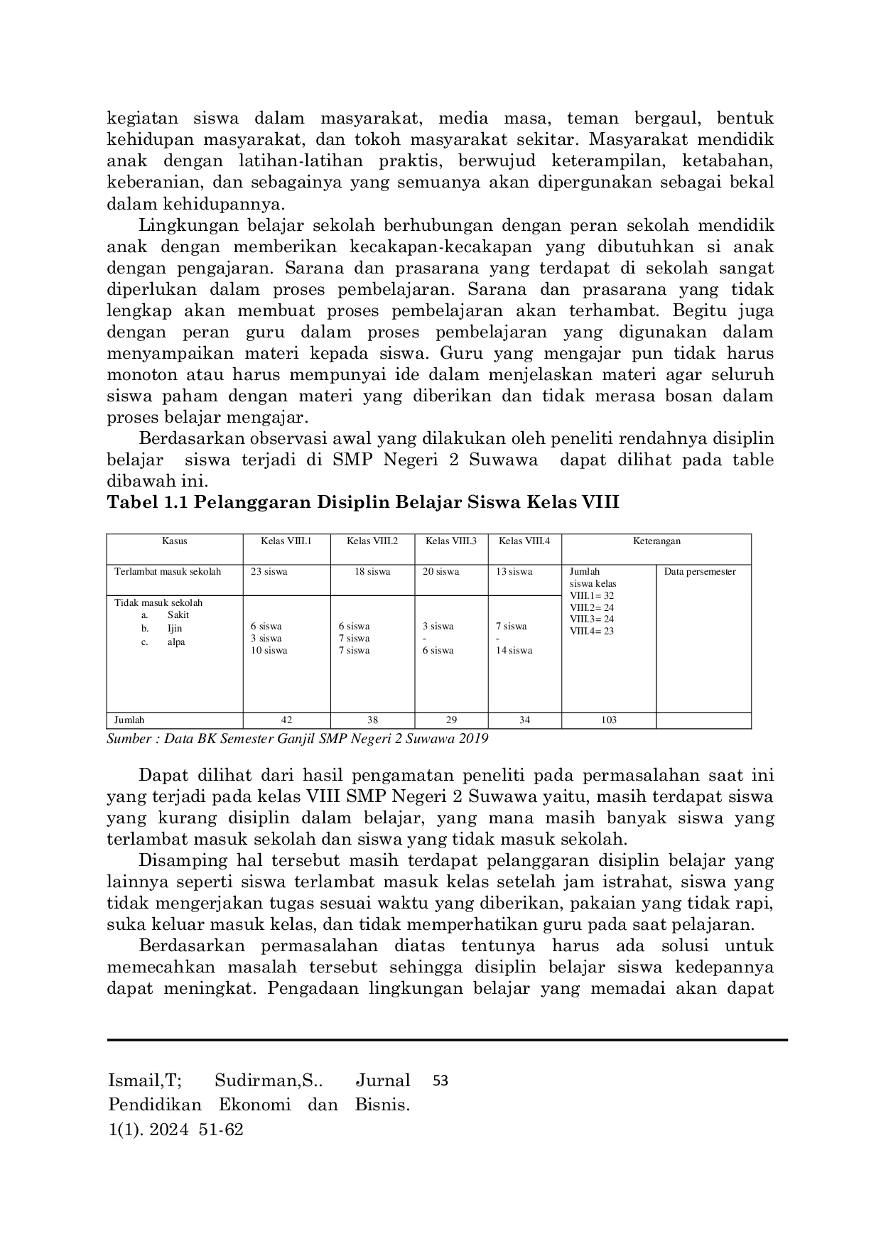 Jurnal Pendidikan Ekonomi dan BisnisJurnal Pendidikan Ekonomi dan BisnisTujuan penelitian ini adalah Untuk mengetahui Pengaruh Lingkungan Belajar Terhadap Disiplin Belajar Siswa Pada Mata Pelajaran IPS Terpadu Di Kelas VIII SMP Negeri 2 Suwawa Kabupaten Bone Bolango Provinsi Gorontalo. Penelitian ini menggunakan pendekatan kuantitatif dengan metode ex post fakto. Sampel penelitian ini adalah siswa kelas VIII SMP Negeri 2 Suwawa Kabupaten Bone Bolango Provinsi Gorontalo yang berjumlah 51 orang. Teknik pengumpulan data diperoleh dari hasil observasi, kuesioner dan dokumentasi. Analisis data menggunakan regresi sederhana dengan bantuan program SPSS 23. Hasil penelitian menunjukkan bahwa lingkungan belajar berpengaruh positif terhadap disiplin belajar dengan koefisien determinasi sebesar 0.177 atau 17.7%. Sisanya 82.3% dipengaruhi oleh faktor lain yang tidak didesain pada penelitian ini.