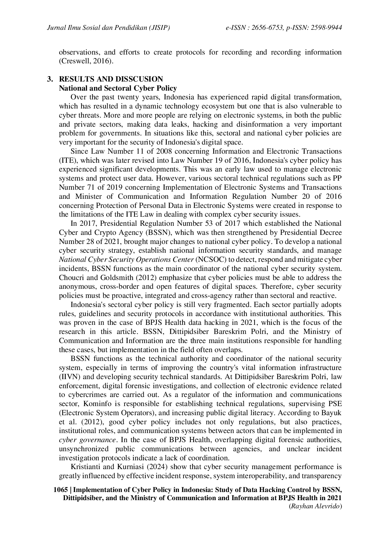 JISIP (Jurnal Ilmu Sosial dan Pendidikan)JISIP (Jurnal Ilmu Sosial dan Pendidikan)Insiden peretasan data BPJS Kesehatan pada tahun 2021 mengungkap permasalahan penting dalam pelaksanaan kebijakan keamanan siber di Indonesia, khususnya terkait efektivitas koordinasi antar lembaga. Penelitian ini meneliti bagaimana respons terhadap insiden dipengaruhi oleh kurangnya sinkronisasi antara Badan Siber dan Sandi Negara (BSSN), Direktorat Kejahatan Siber (Dittipidsiber) Unit Penyidikan Kriminal Polri, dan Kementerian Komunikasi dan Informatika (Kominfo). Metode yang digunakan adalah pendekatan kualitatif dengan tipe studi kasus. Hasil penelitian menunjukkan bahwa proses mitigasi kebocoran data menjadi lebih sulit akibat fragmentasi tugas, tumpang tindih wewenang, dan tidak adanya protokol respons krisis terintegrasi; meskipun masing-masing lembaga memiliki tugas spesifik, kurangnya koordinasi menyebabkan respons yang lambat dan tidak efisien. Selain itu, kerentanan sistemik meningkat karena kebijakan sektoral tidak selaras dengan strategi nasional.