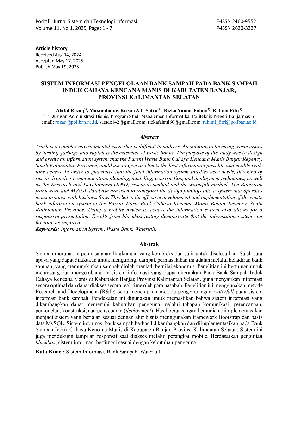 POSITIF : Jurnal Sistem dan Teknologi InformasiPOSITIF : Jurnal Sistem dan Teknologi InformasiSampah merupakan permasalahan lingkungan yang kompleks dan sulit untuk diselesaikan. Salah satu upaya yang dapat dilakukan untuk mengurangi dampak permasalahan ini adalah melalui kehadiran bank sampah, yang memungkinkan sampah diolah menjadi bernilai ekonomis. Penelitian ini bertujuan untuk merancang dan mengembangkan sistem informasi yang dapat diterapkan Pada Bank Sampah Induk Cahaya Kencana Manis di Kabupaten Banjar, Provinsi Kalimantan Selatan, guna menyajikan informasi secara optimal dan dapat diakses secara real-time oleh para nasabah. Penelitian ini menggunakan metode Research and Development (R&D) serta menerapkan metode pengembangan waterfall pada sistem informasi bank sampah. Pendekatan ini digunakan untuk memastikan bahwa sistem informasi yang dikembangkan dapat memenuhi kebutuhan pengguna melalui tahapan komunikasi, perencanaan, pemodelan, konstruksi, dan penyebaran (deployment). Hasil perancangan kemudian diimplementasikan menjadi sistem yang berjalan sesuai dengan alur bisnis menggunakan framework Bootstrap dan basis data MySQL. Sistem informasi bank sampah berhasil dikembangkan dan diimplementasikan pada Bank Sampah Induk Cahaya Kencana Manis di Kabupaten Banjar, Provinsi Kalimantan Selatan. Sistem ini juga mendukung tampilan responsif saat diakses melalui perangkat mobile. Berdasarkan pengujian blackbox, sistem informasi berfungsi sesuai dengan kebutuhan pengguna.
