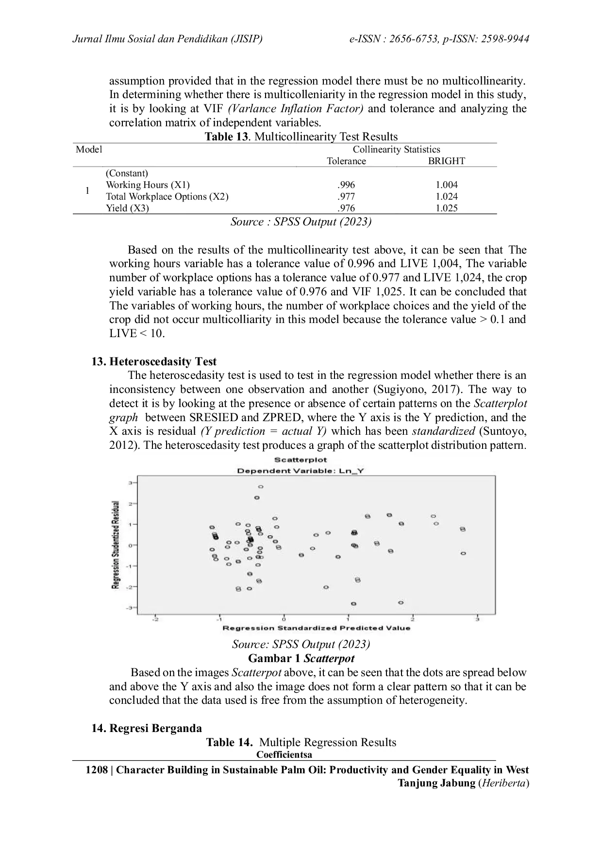 JISIP (Jurnal Ilmu Sosial dan Pendidikan)JISIP (Jurnal Ilmu Sosial dan Pendidikan)Penelitian ini bertujuan untuk: 1) Menganalisis kondisi sosial-ekonomi pekerja lepas di perusahaan perkebunan kelapa sawit berkelanjutan berdasarkan produktivitas dan ketimpangan gender, serta 2) Menganalisis bagaimana produktivitas dan ketimpangan gender memengaruhi perspektif sosial-ekonomi perusahaan perkebunan kelapa sawit berkelanjutan di Kabupaten Tanjung Jabung Barat. Metode penelitian menggunakan pendekatan kualitatif dari perspektif sosial-ekonomi untuk mendapatkan penjelasan yang lebih lengkap dari hasil kuantitatif. Penelitian ini juga menggunakan pendekatan kuantitatif, yaitu regresi ganda dengan sampel 138 pekerja. Lokasi penelitian berada di perusahaan perkebunan kelapa sawit di Kabupaten Tanjung Jabung Barat. Hasil analisis menunjukkan bahwa jam kerja memiliki pengaruh signifikan dan negatif terhadap pendapatan pekerja lepas di perusahaan kelapa sawit. Sementara itu, pilihan jumlah jam kerja tidak memiliki pengaruh signifikan dan bernilai negatif terhadap pendapatan. Di sisi lain, hasil produksi memiliki pengaruh positif dan signifikan terhadap pendapatan pekerja lepas di perusahaan kelapa sawit di Kabupaten Tanjung Jabung Barat.