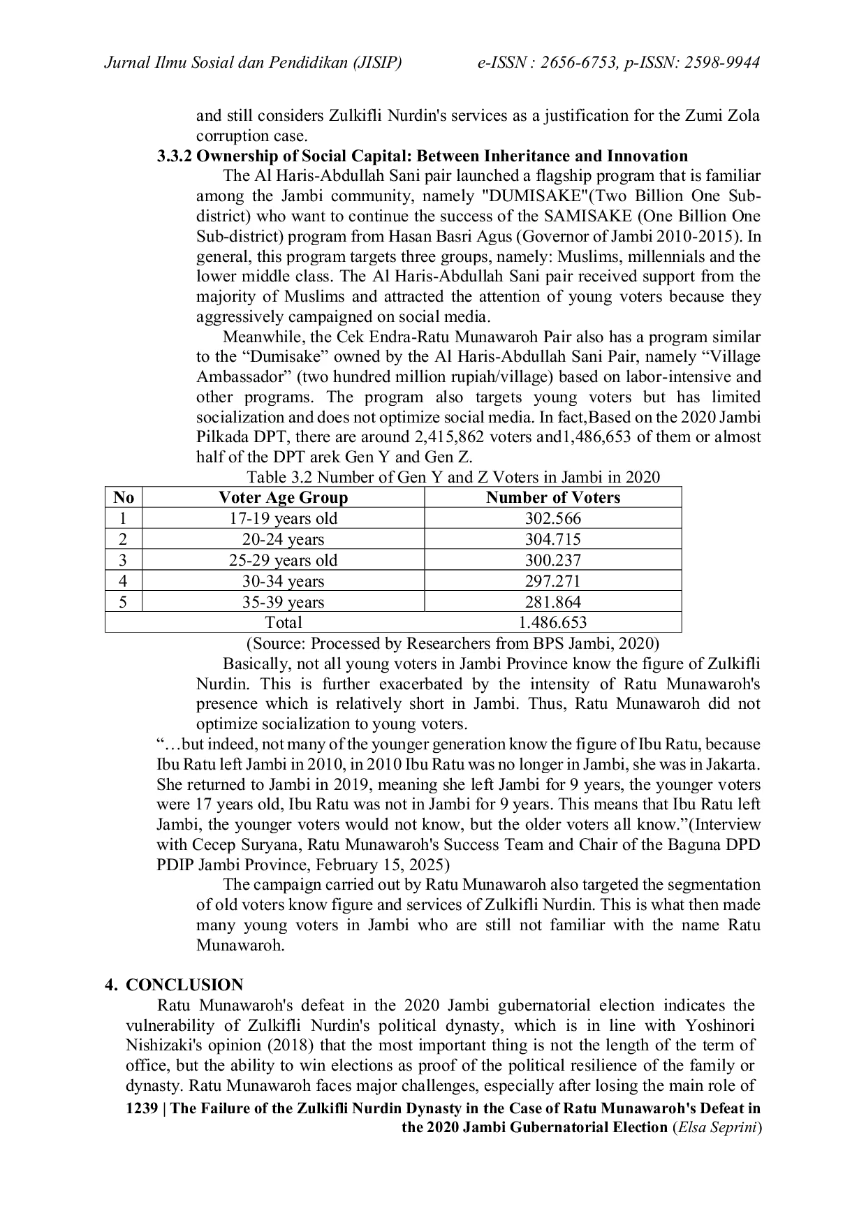 Kekalahan Ratu Munawaroh pada Pilkada gubernur Jambi 2020 menunjukkan kerentanan dinasti politik Zulkifli Nurdin, menegaskan bahwa keberhasilan politik tidak ditentukan oleh lama masa jabatan melainkan kemampuan memenangkan pemilu.Kegagalan tersebut dipicu oleh ketidakmampuan Ratu Munawaroh melakukan strategi penguatan batas, tercermin dari lemahnya jaringan kekerabatan, tidak memperoleh dukungan PAN, serta masalah ekonomi keluarga.Kondisi ini memberi peluang bagi oposisi melakukan pembukaan batas melalui kompetisi sengit dan kampanye negatif, sementara lawan yang memiliki modal sosial lebih kuat serta strategi inovatif berhasil mengalahkan dinasti, menandakan bahwa keberlanjutan kekuasaan dinasti tetap rentan terhadap dinamika politik lokal, opini publik, dan tantangan internal pada era desentralisasi.