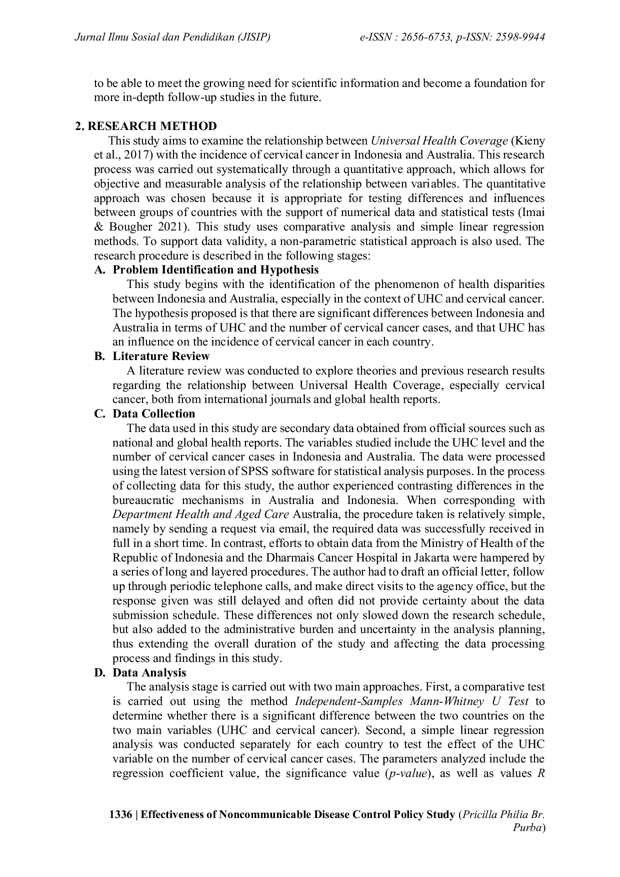 JISIP (Jurnal Ilmu Sosial dan Pendidikan)JISIP (Jurnal Ilmu Sosial dan Pendidikan)Penelitian ini mengeksplorasi hubungan antara Universal Health Coverage (UHC) dan insiden kanker serviks melalui analisis komparatif antara Indonesia dan Australia. Tujuan utama adalah memahami bagaimana cakupan layanan kesehatan memengaruhi pelaporan kasus kanker serviks pada dua negara dengan struktur sistem kesehatan yang berbeda. Analisis menunjukkan bahwa tingkat cakupan UHC yang lebih tinggi cenderung berhubungan dengan peningkatan deteksi kasus kanker serviks, menyoroti peran penting sistem skrining dan akses layanan kesehatan. Selain itu, terdapat perbedaan signifikan dalam struktur dan kualitas layanan kesehatan antara kedua negara yang memengaruhi beban penyakit secara keseluruhan. Penelitian ini menekankan pentingnya penguatan program skrining dan vaksinasi, khususnya di negara dengan cakupan UHC terbatas. Temuan diharapkan dapat berkontribusi pada penelitian selanjutnya serta menjadi dasar pengembangan kebijakan kesehatan yang lebih inklusif dan berkelanjutan.