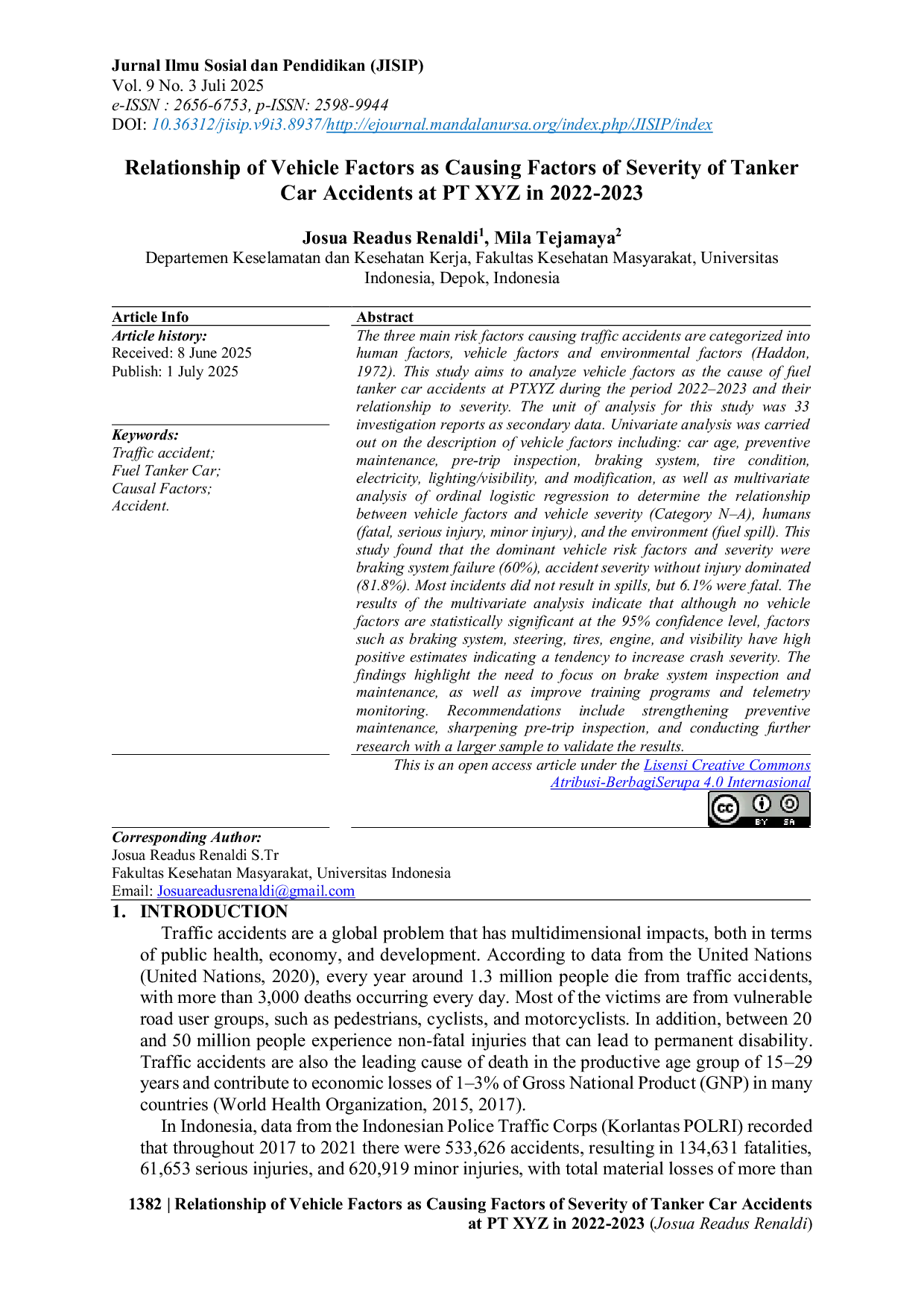 JISIP (Jurnal Ilmu Sosial dan Pendidikan)JISIP (Jurnal Ilmu Sosial dan Pendidikan)Tiga faktor risiko utama yang menyebabkan kecelakaan lalu lintas dikategorikan menjadi faktor manusia, faktor kendaraan, dan faktor lingkungan (Haddon, 1972). Penelitian ini bertujuan menganalisis faktor kendaraan sebagai penyebab kecelakaan truk tangki bahan bakar di PT XYZ pada periode 2022–2023 serta hubungannya dengan tingkat keparahan. Analisis dilakukan terhadap 33 laporan investigasi sebagai data sekunder; analisis univariat menggambarkan faktor kendaraan (usia kendaraan, pemeliharaan preventif, kondisi ban pra‑perjalanan, kelistrikan, penerangan/visibilitas, dan modifikasi), sedangkan regresi logistik ordinal multivariat mengevaluasi hubungan faktor kendaraan dengan keparahan kecelakaan kendaraan, manusia, dan lingkungan (tumpahan bahan bakar). Hasil menunjukkan kegagalan sistem rem menjadi faktor dominan (60%) dan mayoritas kecelakaan tidak menimbulkan cedera (81,8%) serta jarang menimbulkan tumpahan, meski 6,1% berakibat fatal. Meskipun tidak ada faktor yang signifikan secara statistik pada tingkat kepercayaan 95%, variabel seperti rem, kemudi, ban, mesin, dan visibilitas memiliki estimasi positif tinggi yang mengindikasikan potensi meningkatkan tingkat keparahan kecelakaan. Temuan menekankan pentingnya inspeksi dan pemeliharaan sistem rem serta peningkatan program pelatihan dan pemantauan telemetri.