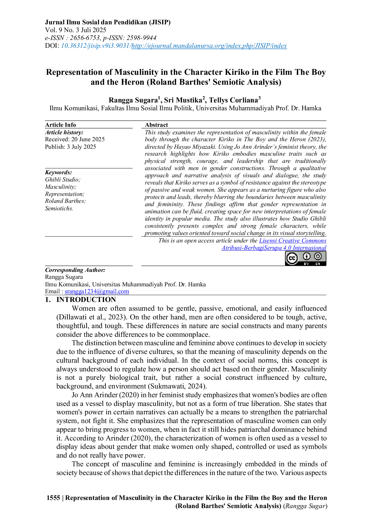 JISIP (Jurnal Ilmu Sosial dan Pendidikan)JISIP (Jurnal Ilmu Sosial dan Pendidikan)Studi ini meneliti representasi maskulinitas dalam tubuh perempuan melalui karakter Kiriko dalam film The Boy and the Heron (2023), disutradarai oleh Hayao Miyazaki. Menggunakan teori feminis Jo Ann Arinder, penelitian ini menekankan bagaimana Kiriko mewujudkan sifat maskulin seperti kekuatan fisik, keberanian, dan kepemimpinan yang secara tradisional dikaitkan dengan pria dalam konstruksi gender. Melalui pendekatan kualitatif dan analisis naratif dari visual dan dialog, studi ini mengungkapkan bahwa Kiriko berfungsi sebagai simbol perlawanan terhadap stereotip wanita yang pasif dan lemah. Dia muncul sebagai figur yang penuh kasih sayang yang juga melindungi dan memimpin, sehingga menghapus batas-batas antara maskulinitas dan femininitas. Temuan ini menegaskan bahwa representasi gender dalam animasi dapat bersifat cair, menciptakan ruang untuk interpretasi baru tentang identitas perempuan dalam media populer. Studi ini juga menggambarkan bagaimana Studio Ghibli secara konsisten menampilkan karakter perempuan yang kompleks dan kuat, sambil mempromosikan nilai-nilai yang mengarah pada perubahan sosial dalam cerita visualnya.