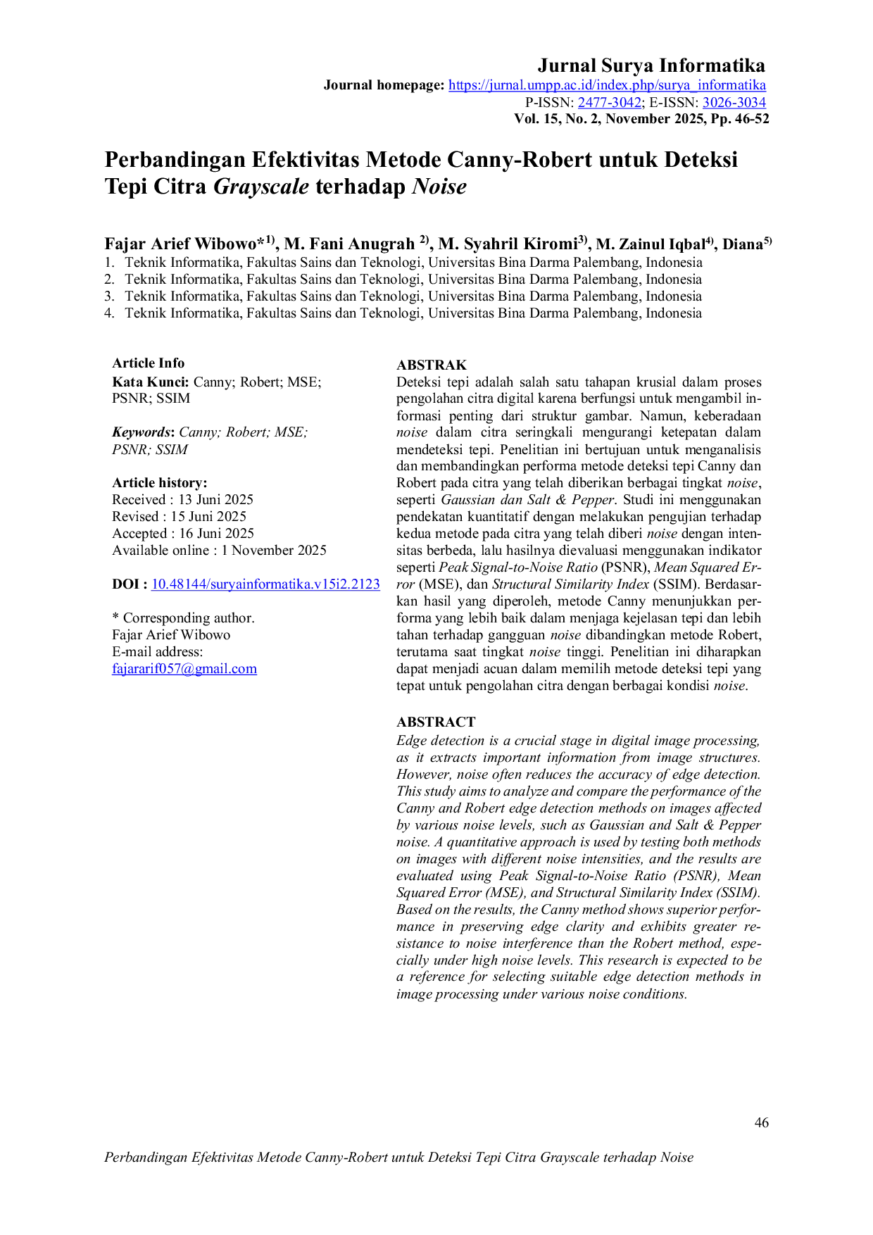 Jurnal Surya InformatikaJurnal Surya InformatikaPenelitian ini bertujuan untuk menganalisis dan membandingkan performa metode deteksi tepi Canny dan Robert pada citra yang telah diberikan berbagai tingkat noise, seperti Gaussian dan Salt & Pepper. Studi ini menggunakan pendekatan kuantitatif dengan melakukan pengujian terhadap kedua metode pada citra yang telah diberi noise dengan intensitas berbeda, lalu hasilnya dievaluasi menggunakan indikator seperti Peak Signal-to-Noise Ratio (PSNR), Mean Squared Error (MSE), dan Structural Similarity Index (SSIM).