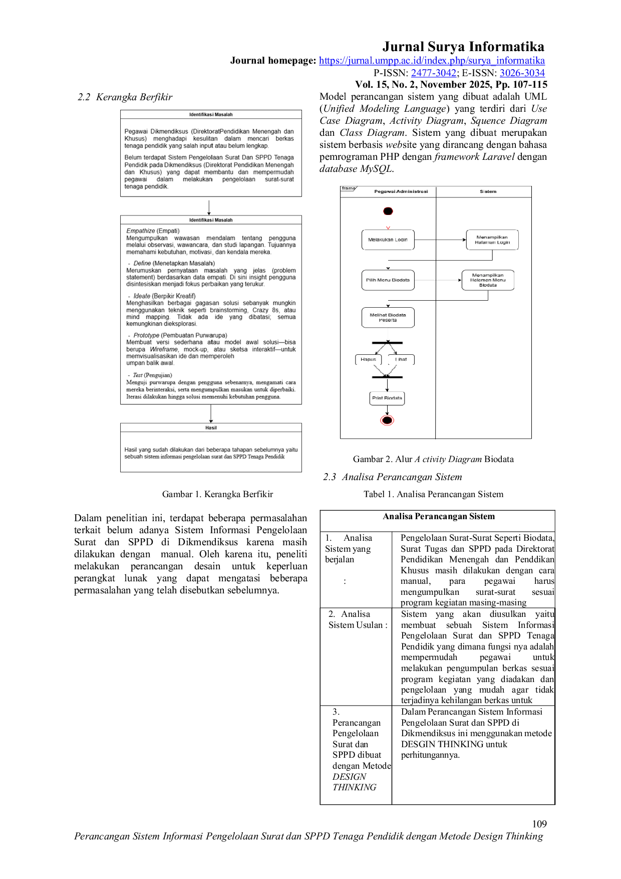 Jurnal Surya InformatikaJurnal Surya InformatikaPengelolaan surat dan Surat Perintah Perjalanan Dinas (SPPD) di institusi pendidikan masih banyak dilakukan secara manual. Ini mengakibatkan inefisiensi, kesulitan pencarian arsip, dan risiko kehilangan dokumen. Tujuan penelitian ini adalah untuk membuat solusi yang berpusat pada kebutuhan pengguna dengan menggunakan pendekatan Design Thinking untuk membangun Sistem Informasi Pengelolaan Surat dan SPPD untuk tenaga pendidik. Metode Design Thinking termasuk empathize, define, ideate, prototype, dan test. Pengumpulan data dilakukan melalui pembacaan literatur, observasi, dan wawancara dengan karyawan administrasi dan guru. Hasil perancangan dituangkan dalam bentuk prototype sistem berbasis web dan model pemodelan (UML). Model ini mencakup fitur pembuatan program kegiatan, unggah bukti transportasi, SPPD dan biodata. Untuk mengevaluasi efektivitas dan kemudahan penggunaan prototype, pengujian kegunaan dilakukan dengan instrumen standar (misalnya SUS/UEQ) dan pengamatan tugas.