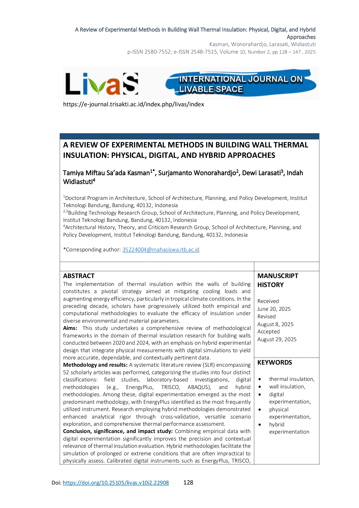 International Journal on Livable SpaceInternational Journal on Livable SpaceImplementasi isolasi termal pada dinding bangunan menjadi strategi penting untuk mengurangi beban pendinginan dan meningkatkan efisiensi energi, terutama pada iklim tropis. Selama dekade terakhir, peneliti secara bertahap menggunakan metodologi empiris maupun komputasional untuk mengevaluasi efektivitas isolasi di bawah berbagai kondisi lingkungan dan material. Penelitian ini melakukan tinjauan komprehensif terhadap kerangka metodologis penelitian isolasi termal dinding bangunan yang dipublikasikan antara tahun 2020 hingga 2024, dengan penekanan pada desain eksperimental hibrida yang mengintegrasikan pengukuran fisik dengan simulasi digital untuk menghasilkan data yang lebih akurat, dapat diandalkan, dan relevan secara kontekstual. Metode yang digunakan berupa systematic literature review (SLR) terhadap 52 artikel ilmiah, yang dikategorikan menjadi empat pendekatan: eksperimen fisik lapangan, eksperimen fisik laboratorium, eksperimen digital, dan eksperimen hibrida. Eksperimen digital mendominasi (46%) dengan EnergyPlus sebagai alat paling sering dipakai, sementara eksperimen hibrida menunjukkan peningkatan rigor analitis melalui validasi silang, eksplorasi skenario yang beragam, dan penilaian kinerja termal menyeluruh. Penggabungan data empiris dengan eksperimen digital secara signifikan meningkatkan presisi dan relevansi kontekstual evaluasi isolasi termal, serta memungkinkan simulasi kondisi jangka panjang atau ekstrem yang sulit dilakukan secara fisik.