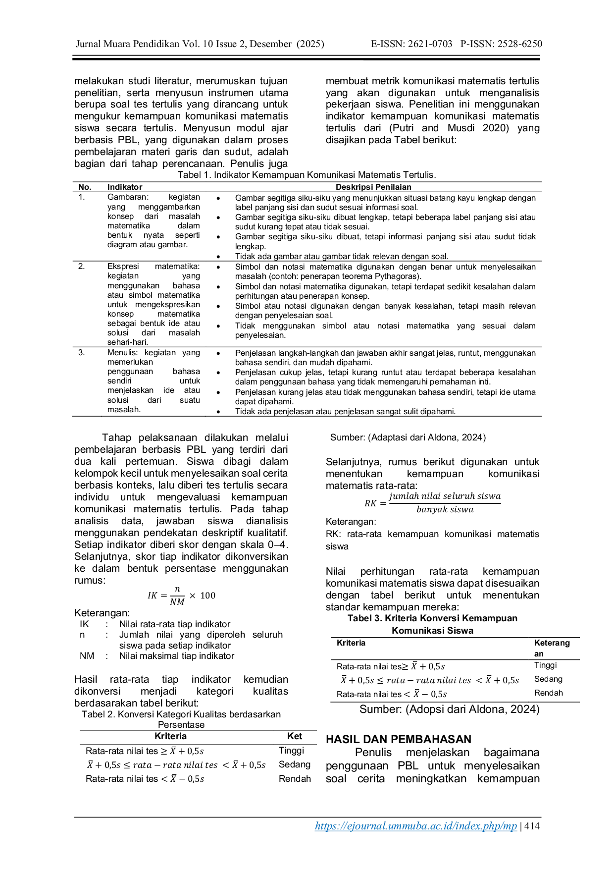 Jurnal Muara PendidikanJurnal Muara PendidikanKemampuan komunikasi matematis sangat penting untuk pembelajaran matematika, terutama dalam memahami dan menyelesaikan soal cerita, yang membutuhkan pemahaman konsep dan penyampaian ide secara sistematis. Salah satu cara untuk membantu siswa memperoleh kemampuan tersebut adalah dengan menerapkan metode pembelajaran berbasis masalah (PBL), yang memungkinkan mereka untuk terlibat secara aktif dalam proses pemecahan masalah dan eksplorasi masalah. Penelitian ini bertujuan untuk menganalisis kemampuan komunikasi matematis tulisan siswa melalui penerapan PBL pada penyelesaian soal cerita. Metode penelitian yang digunakan adalah deskriptif kualitatif dengan subjek sebanyak 8 siswa kelas VII. Data dikumpulkan melalui tes tertulis, observasi, dan dokumentasi, kemudian dianalisis berdasarkan tiga indikator utama: visualisasi konsep, penggunaan simbol matematika, dan kemampuan menulis penjelasan secara sistematis. Hasil penelitian menunjukkan bahwa siswa secara umum berada dalam kategori tinggi dalam komunikasi matematis tulisan, dengan rata-rata skor 78, tetapi ada perbedaan di antara siswa: empat siswa berada dalam kategori tinggi (83-100), satu siswa dalam kategori sedang (75), dan tiga siswa dalam kategori rendah (58-67). Siswa dalam kategori tinggi mampu menuliskan solusi dengan runtut dan jelas, sementara siswa dalam kategori rendah masih mengalami kesulitan menyusun argumen matematis. Dengan demikian, PBL dapat membantu siswa dalam komunikasi matematis tulisan, terutama dalam memahami dan menyelesaikan soal cerita.