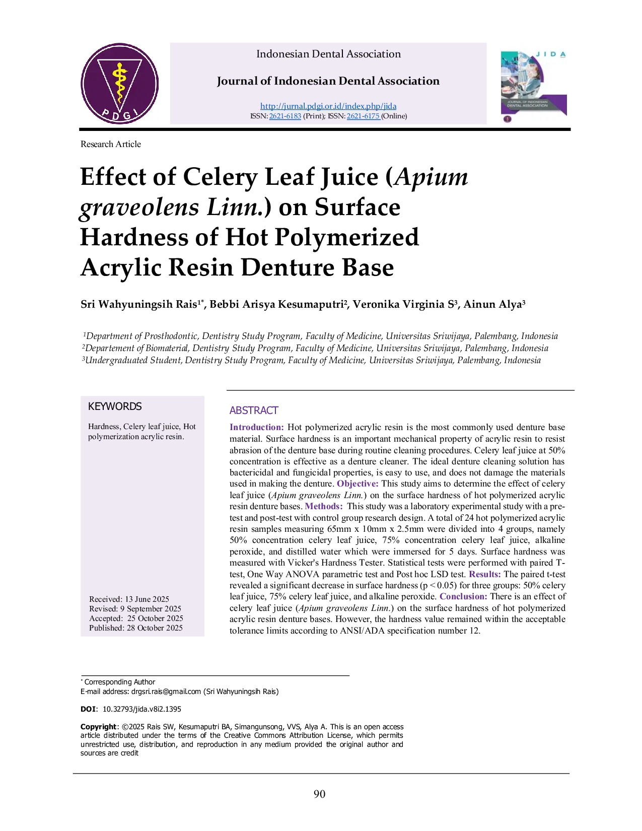 Journal of Indonesian Dental AssociationJournal of Indonesian Dental AssociationDenture base resin akrilik polimerisasi panas merupakan bahan dasar gigi tiruan yang paling umum digunakan. Kekerasan permukaan adalah sifat mekanik penting dari resin akrilik untuk menahan abrasi denture base selama prosedur pembersihan rutin. Perasan daun celery pada konsentrasi 50% terbukti efektif sebagai pembersih denture. Solusi pembersih denture yang ideal memiliki sifat bakterisida dan fungisida, mudah digunakan, dan tidak merusak bahan yang digunakan dalam pembuatan denture. Penelitian ini bertujuan untuk menentukan pengaruh perasan daun celery (Apium graveolens Linn.) terhadap kekerasan permukaan denture base resin akrilik polimerisasi panas. Penelitian ini merupakan penelitian eksperimental laboratorium dengan desain pre-test dan post-test dengan kelompok kontrol. Sebanyak 24 sampel resin akrilik polimerisasi panas berukuran 65mm x 10mm x 2,5mm dibagi menjadi 4 kelompok, yaitu perasan daun celery 50%, perasan daun celery 75%, peroksid alkali, dan air suling yang direndam selama 5 hari. Kekerasan permukaan diukur dengan Vickers Hardness Tester. Uji statistik dilakukan dengan paired T-test, One Way ANOVA uji parametrik, dan Post hoc LSD test. Hasil menunjukkan bahwa ada penurunan signifikan dalam kekerasan permukaan (p < 0,05) untuk tiga kelompok: perasan daun celery 50%, perasan daun celery 75%, dan peroksid alkali. Namun, nilai kekerasan tetap berada dalam batas toleransi yang dapat diterima menurut spesifikasi ANSI/ADA nomor 12.