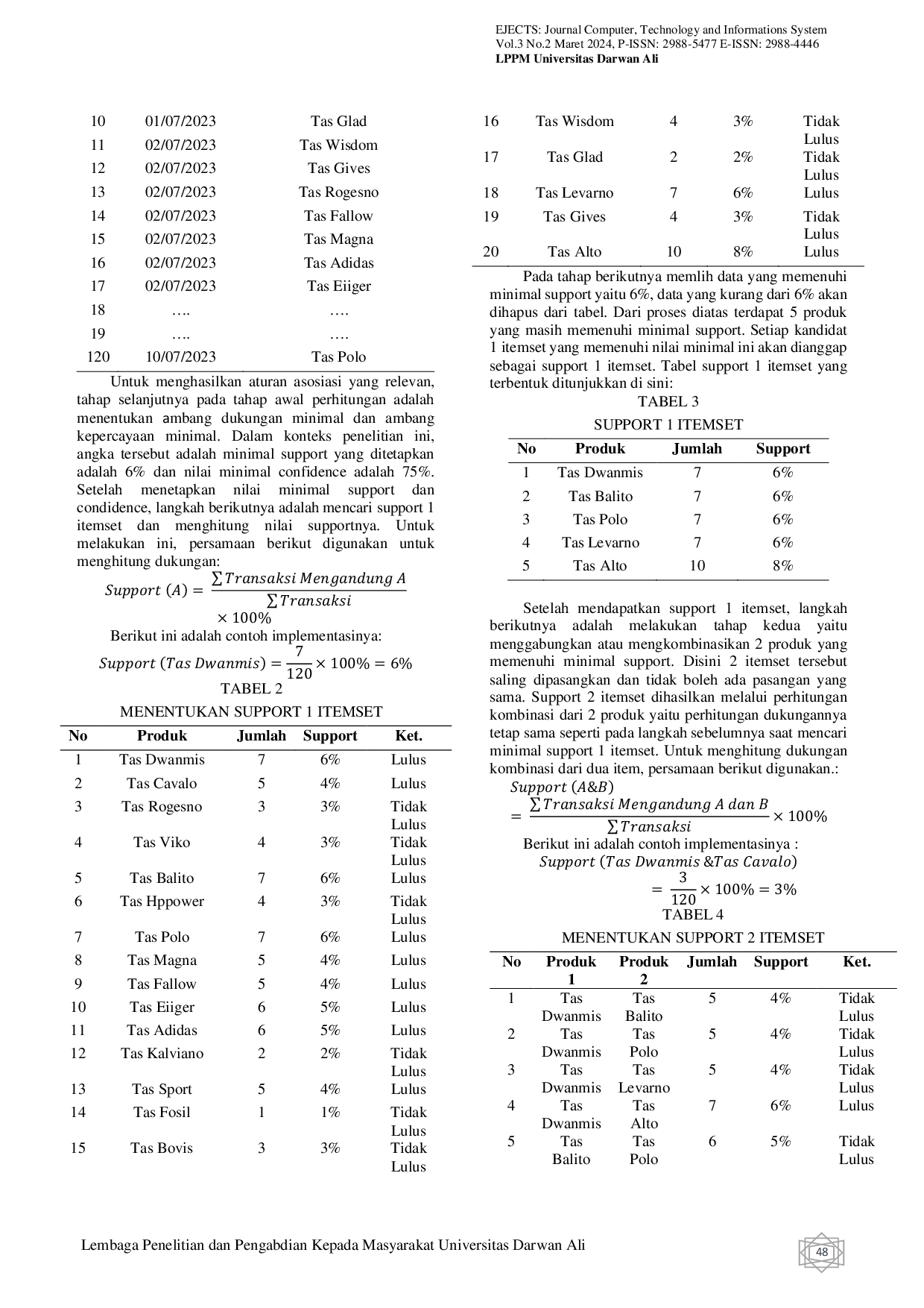 Berdasarkan analisis yang telah dilakukan melalui penerapan teknik data mining dengan menggunakan algoritma Apriori, dapat disimpulkan bahwa dari 120 catatan transaksi yang telah diolah dari toko Dimas Jaya, dimana batas dukungan minimum adalah 6% dan tingkat kepercayaan minimum adalah 75%, berhasil diidentifikasi 4 peraturan asosiasi yang memiliki relevansi.Selain itu, kelima peraturan asosiasi tersebut juga menunjukkan bahwa nilai rasio lift-nya melebihi angka 1.Pemilik toko dapat menggunakan hasil untuk membuat rencana bisnis.Sebagai contoh, saya dapat membuat rencana penempatan barang dengan meletakkan produk tas levarno di dekat tas dwanmis dan tas polo, serta tas Balito dan tas alto secara urut dan tersusun dengan benar.