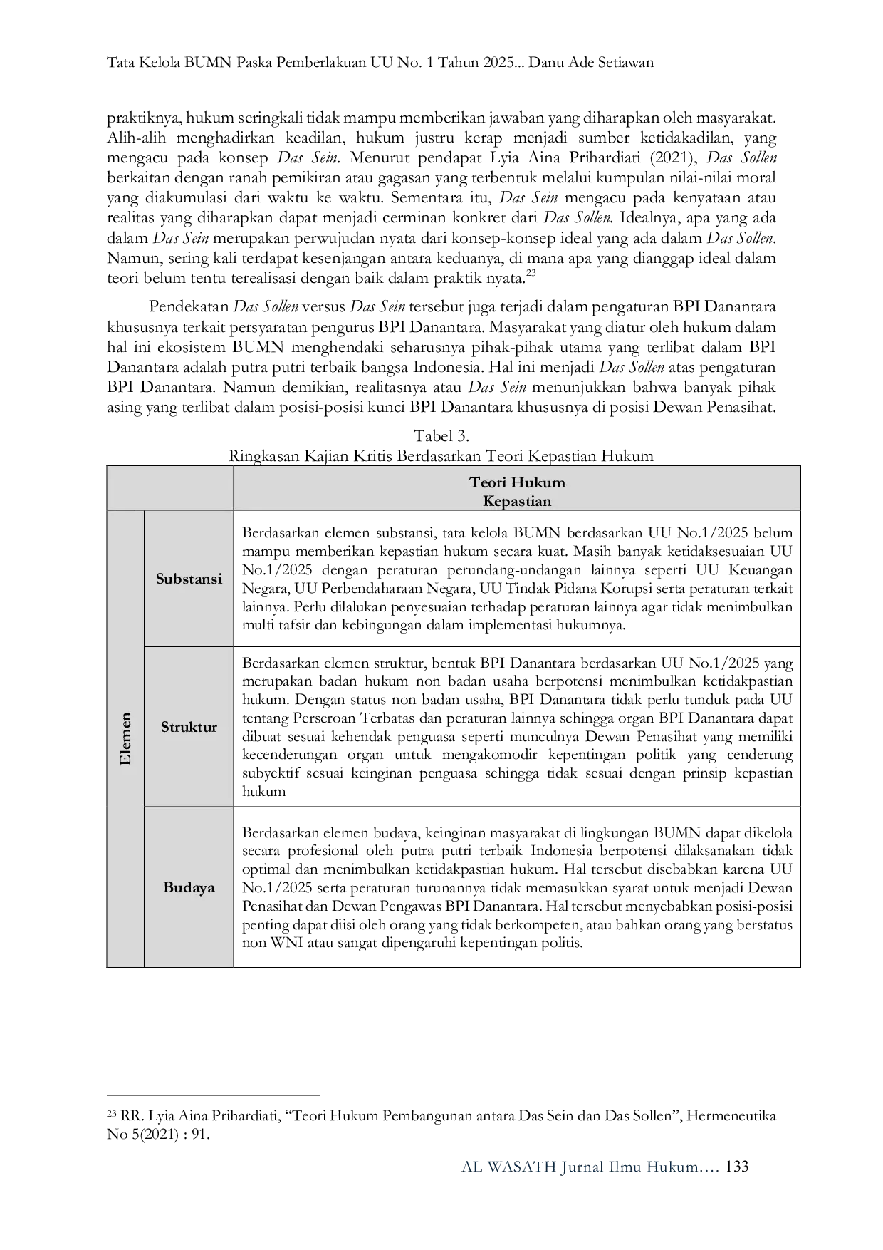 AL WASATH Jurnal Ilmu HukumAL WASATH Jurnal Ilmu HukumPemberlakuan Undang-Undang Nomor 1 Tahun 2025 tentang Perubahan Ketiga atas Undang-Undang No.19 Tahun 2003 tentang Badan Usaha Milik Negara termasuk pembentukan BPI Danantara menandakan perubahan tata kelola BUMN di Indonesia yang semula dilakukan dengan pendekatan kekayaan negara berubah menjadi tata kelola BUMN secara profesional berdasarkan profesionalisme bisnis. Penelitian ini bertujuan untuk mengkaji sejauh mana perubahan tata kelola BUMN paska Undang-Undang Nomor 1 Tahun 2025 tersebut telah memenuhi prinsip teori kepastian hukum. Analisa secara mendalam dilakukan melalui tiga pilar utama penegakan hukum, yaitu kualitas norma atau aturan hukum (substansi), kinerja dan peran lembaga terkait (struktur), serta pola pikir, sikap, dan perilaku masyarakat terhadap hukum (budaya hukum). Hasil penelitian menunjukkan bahwa dipandang dari teori kepastian hukum, secara substansi masih banyak ditemukan ketidaksesuaian pengaturan pada Undang-Undang Nomor 1 Tahun 2025 dengan peraturan perundang-undangan lainnya yang terkait seperti Undang-Undang yang mengatur tentang keuangan negara, perbendaharaan negara, tindak pidana korupsi serta peraturan terkait lainnya yang berpotensi menyebabkan multitafsir dalam implementasi hukum sekaligus menyebabkan ketidakpastian hukum.
