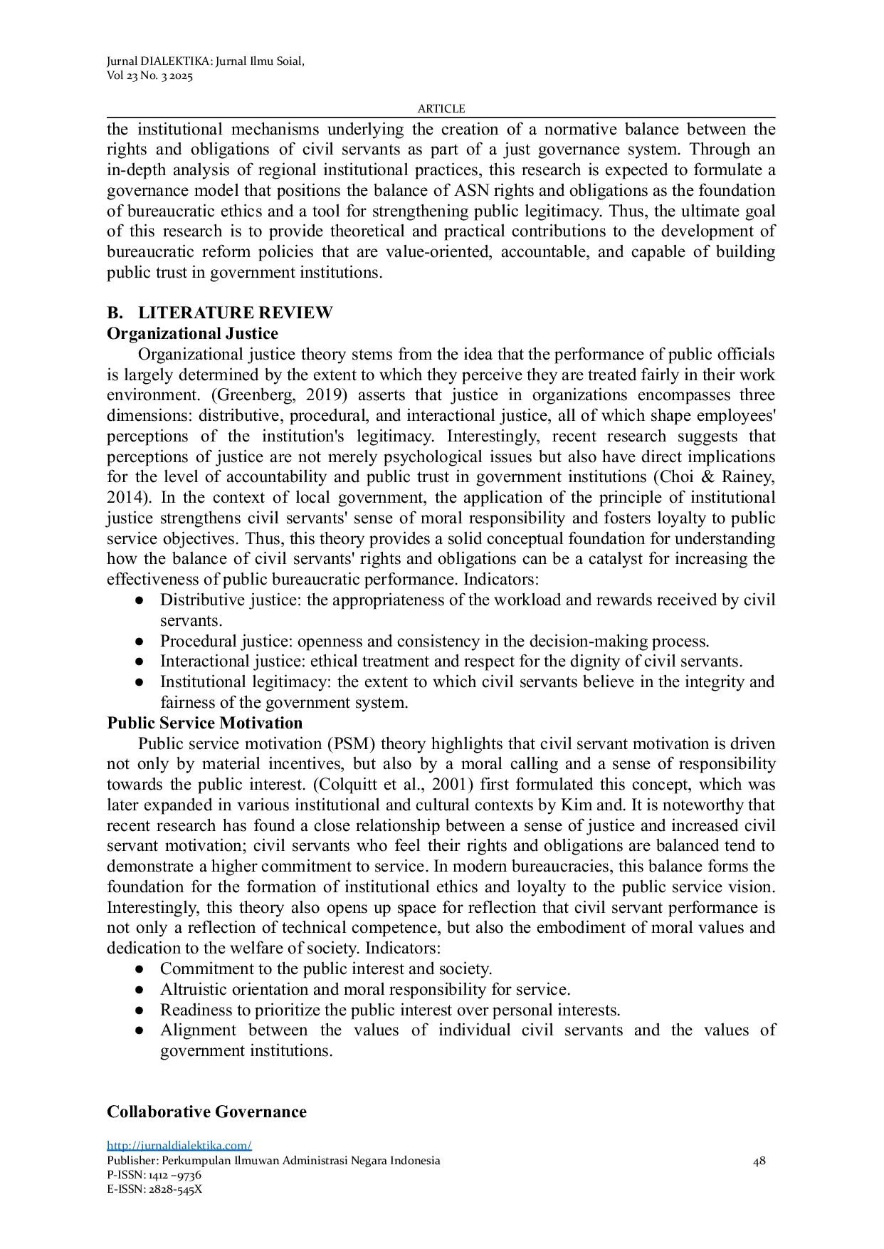 Jurnal Dialektika: Jurnal Ilmu SosialJurnal Dialektika: Jurnal Ilmu SosialPenelitian ini dilatarbelakangi oleh ketidakseimbangan antara hak dan kewajiban ASN yang menghambat kinerja birokrasi serta merusak kepercayaan publik terhadap pemerintahan daerah. Keurgensiannya terletak pada perlunya reformasi institusi yang berlandaskan keadilan dan akuntabilitas publik. Penelitian ini bertujuan menganalisis peran penyeimbangan hak‑kewajiban sebagai determinan institusional terhadap kinerja birokrasi, dengan kerangka teori keadilan organisasi, motivasi pelayanan publik, dan tata kelola kolaboratif. Metode kualitatif berupa studi kasus institusional dilakukan, data dikumpulkan melalui wawancara mendalam, observasi partisipatif, dan analisis dokumen. Hasil menunjukkan bahwa penyeimbangan hak dan kewajiban meningkatkan motivasi, legitimasi, dan transparansi melalui penerapan sistem administrasi digital (HRIS). Studi ini menekankan kebutuhan sinergi antara teknologi, kebijakan publik, dan tata kelola etis untuk memperkuat integritas birokrasi.