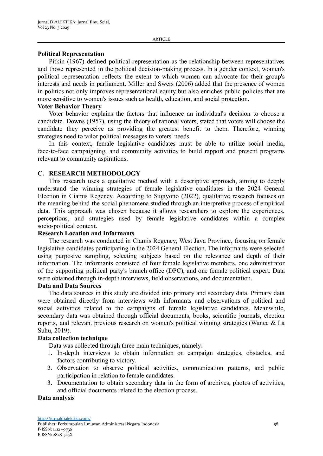 Jurnal Dialektika: Jurnal Ilmu SosialJurnal Dialektika: Jurnal Ilmu SosialStudi ini menganalisis strategi kemenangan calon legislatif perempuan dalam pemilihan umum tahun 2024 di Kabupaten Ciamis dengan pendekatan kualitatif melalui wawancara mendalam dengan enam informan, termasuk calon legislatif, kader partai, dan pengamat politik. Hasil penelitian menunjukkan bahwa strategi kemenangan mengintegrasikan tiga modal utama sesuai teori Ronald S. Burt (1995): modal finansial, modal manusia, dan modal sosial. Meskipun menghadapi keterbatasan dana, calon perempuan mampu mengoptimalkan sumber daya melalui pengelolaan dana yang efisien, peningkatan kapasitas kepemimpinan, dan penguatan jaringan sosial berbasis masyarakat. Pola integrasi ketiga modal ini secara efektif mengatasi hambatan struktural seperti budaya patriarki dan akses politik terbatas. Penelitian ini mengonfirmasi relevansi teori tiga modal Burt dalam konteks politik lokal Indonesia, dengan menyesuaikan diri dengan dinamika digital. Implikasi praktisnya menekankan pentingnya pengembangan kader politik perempuan secara holistik dan kebijakan pendanaan alternatif berbasis crowdfunding.