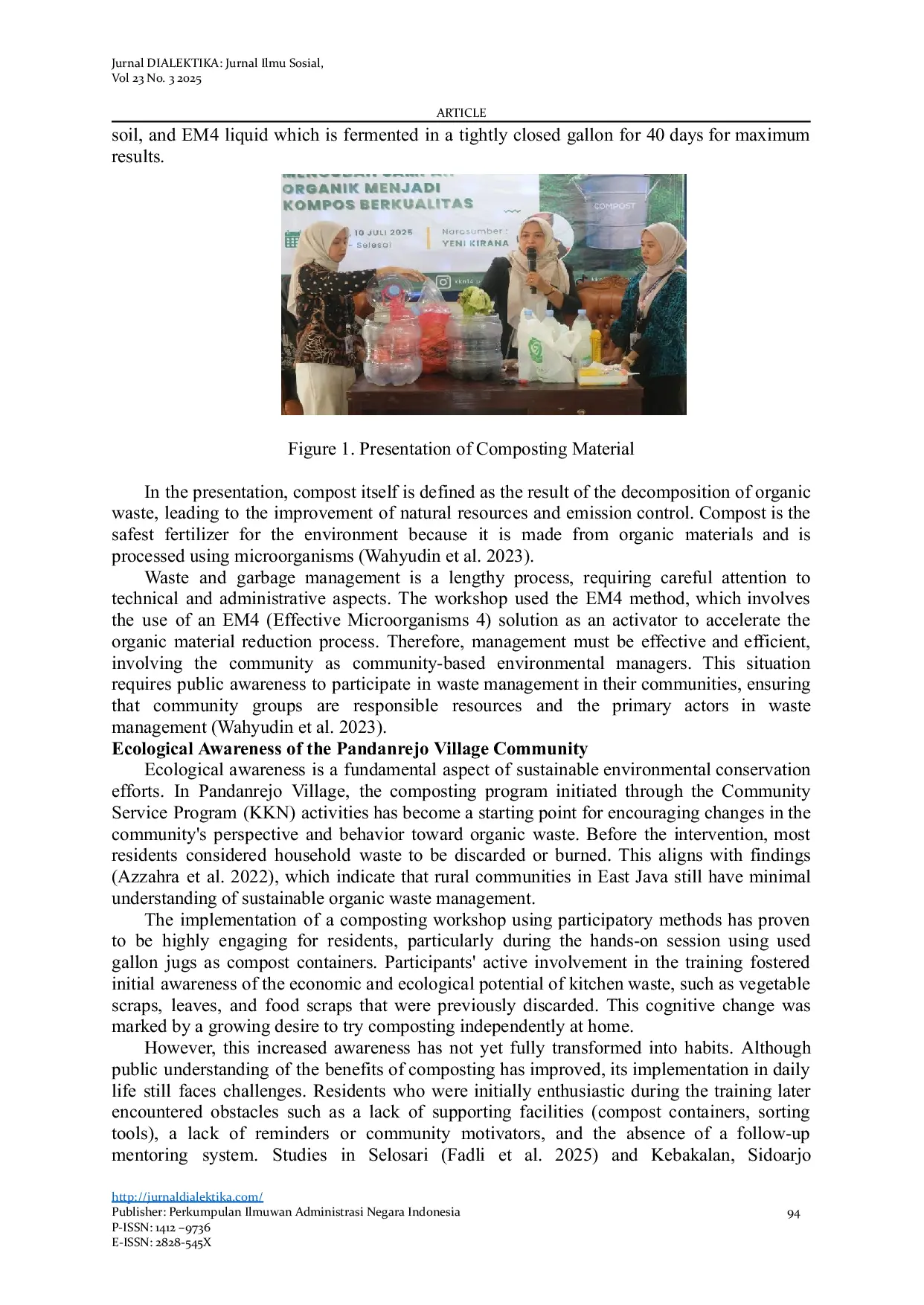 Jurnal Dialektika: Jurnal Ilmu SosialJurnal Dialektika: Jurnal Ilmu SosialEnvironmental issues in rural areas remain a serious challenge. Improperly managed waste can lead to environmental pollution. Waste management can transform it into economic and ecological value, such as by converting organic waste into compost. This waste management program is implemented through a participatory and educational approach. This waste workshop aims to raise public awareness of the importance of proper organic waste management. Long-term collaboration between the government, educational institutions, and communities is essential to ensure composting becomes more than a temporary activity but a part of peoples lifestyles.