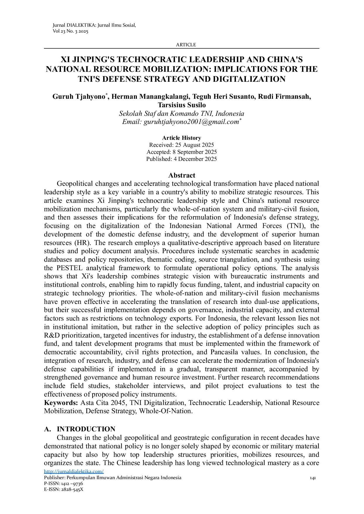 Jurnal Dialektika: Jurnal Ilmu SosialJurnal Dialektika: Jurnal Ilmu SosialGeopolitical changes and accelerating technological transformation have placed national leadership style as a key variable in a countrys ability to mobilize strategic resources. This article examines Xi Jinpings technocratic leadership style and Chinas national resource mobilization mechanisms, particularly the whole-of-nation system and military-civil fusion, and then assesses their implications for the reformulation of Indonesias defense strategy, focusing on the digitalization of the Indonesian National Armed Forces (TNI), the development of the domestic defense industry, and the development of superior human resources (HR). The research employs a qualitative-descriptive approach based on literature studies and policy document analysis. Procedures include systematic searches in academic databases and policy repositories, thematic coding, source triangulation, and synthesis using the PESTEL analytical framework to formulate operational policy options. The analysis shows that Xis leadership combines strategic vision with bureaucratic instruments and institutional controls, enabling him to rapidly focus funding, talent, and industrial capacity on strategic technology priorities. The whole-of-nation and military-civil fusion mechanisms have proven effective in accelerating the translation of research into dual-use applications, but their successful implementation depends on governance, industrial capacity, and external factors such as restrictions on technology exports. For Indonesia, the relevant lesson lies not in institutional imitation, but rather in the selective adoption of policy principles such as R&D prioritization, targeted incentives for industry, the establishment of a defense innovation fund, and talent development programs that must be implemented within the framework of democratic accountability, civil rights protection, and Pancasila values. In conclusion, the integration of research, industry, and defense can accelerate the modernization of Indonesias defense capabilities if implemented in a gradual, transparent manner, accompanied by strengthened governance and human resource investment.